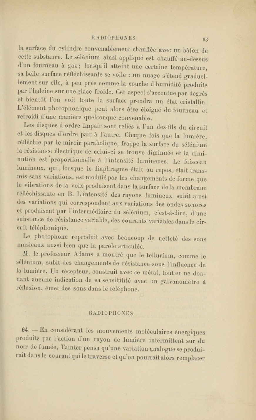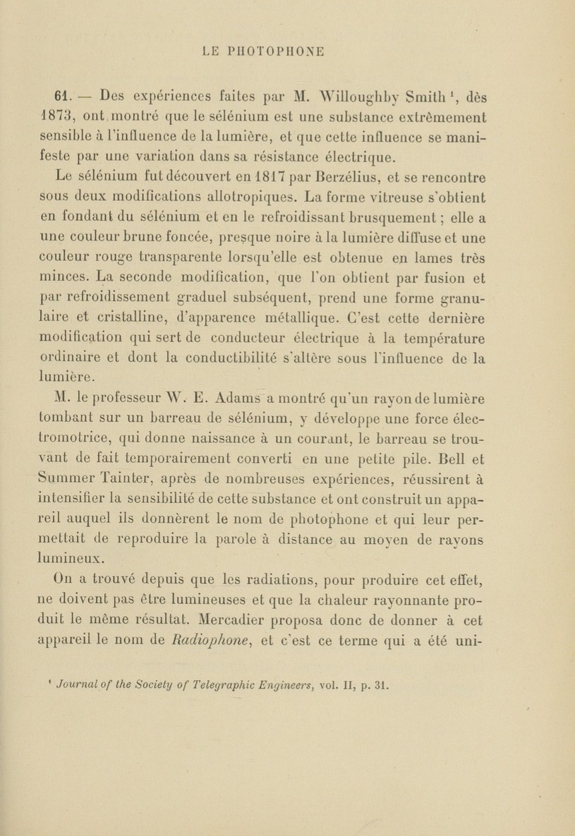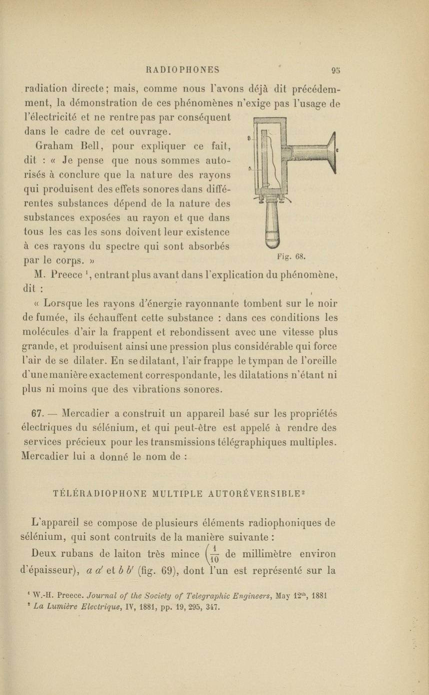 Dans ces pages extraites de l’ouvrage de William -Henri Preece “Le téléphone” 1891 concernant le Photophone (Bell et Tainter) et le Radiophone (Mercadier)