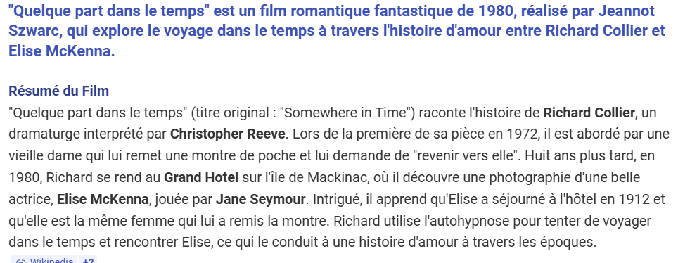 J’allais oublier, un très beau film, et une belle histoire d’amour : « Quelque-part dans le temps » (Somewhere in Time), avec Christopher Reeves et Jane Seymour. Et une belle musique signée John Barry.