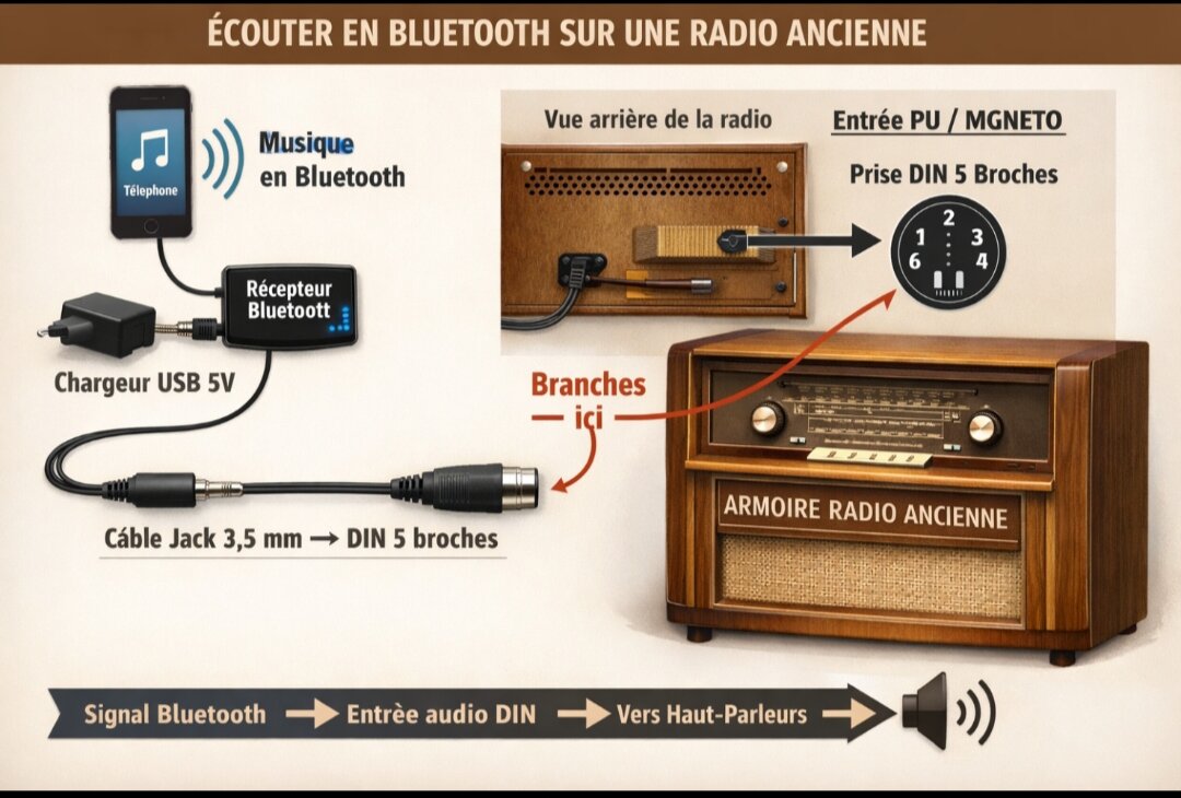 J’aimerai conservé le meuble d’origine car j’écoute souvent la radio, mais j’aimerai aussi écouter en bluetooth et profiter du son de ce meuble radio