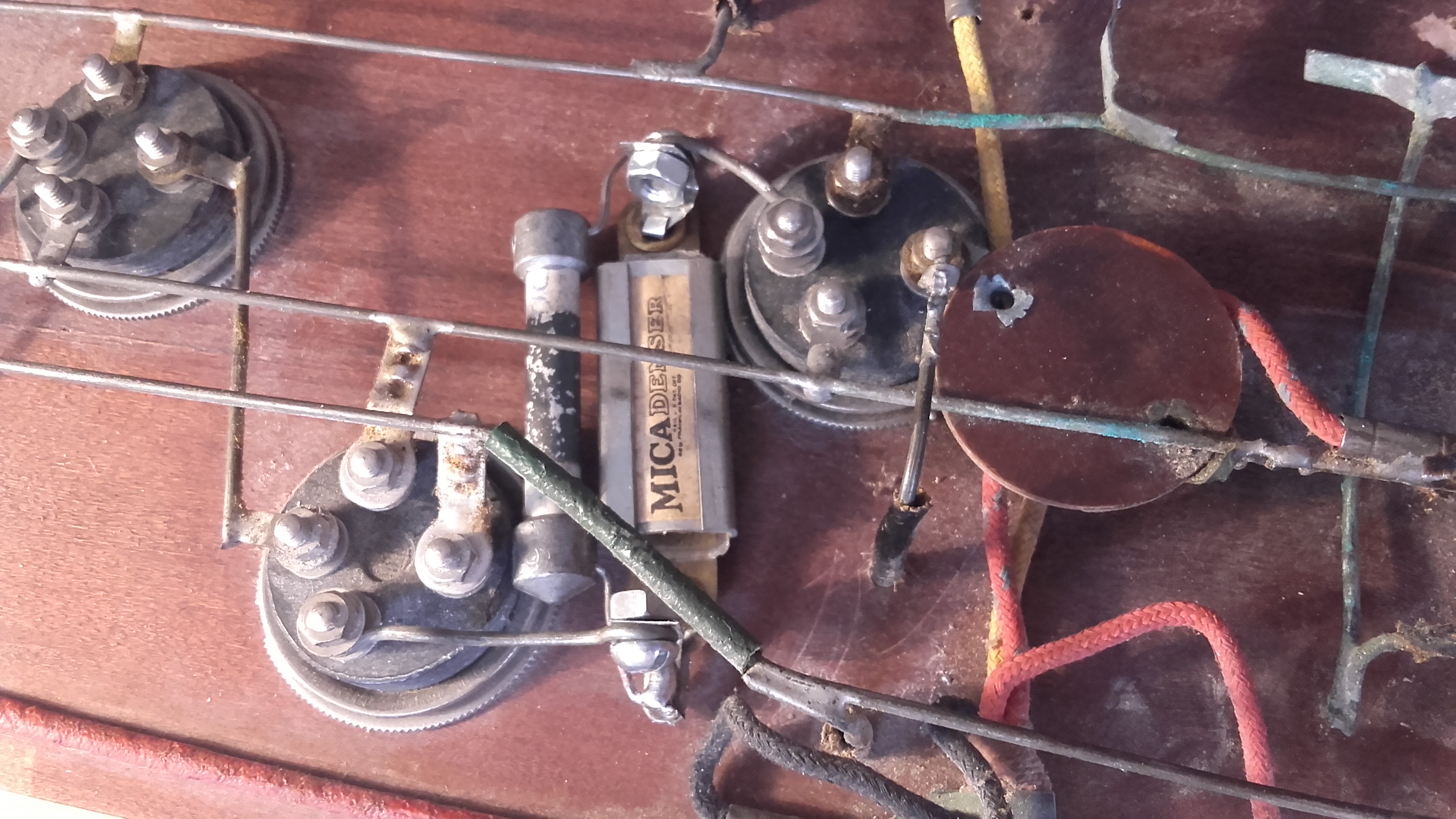 J’ai trouvé dans mon tiroir de pièces détachées des années 1920 un mica de 200 pF et une résistance de 2 Meg, pour la détection. Comme vous l’avez vu, la radio manquait ces composants.