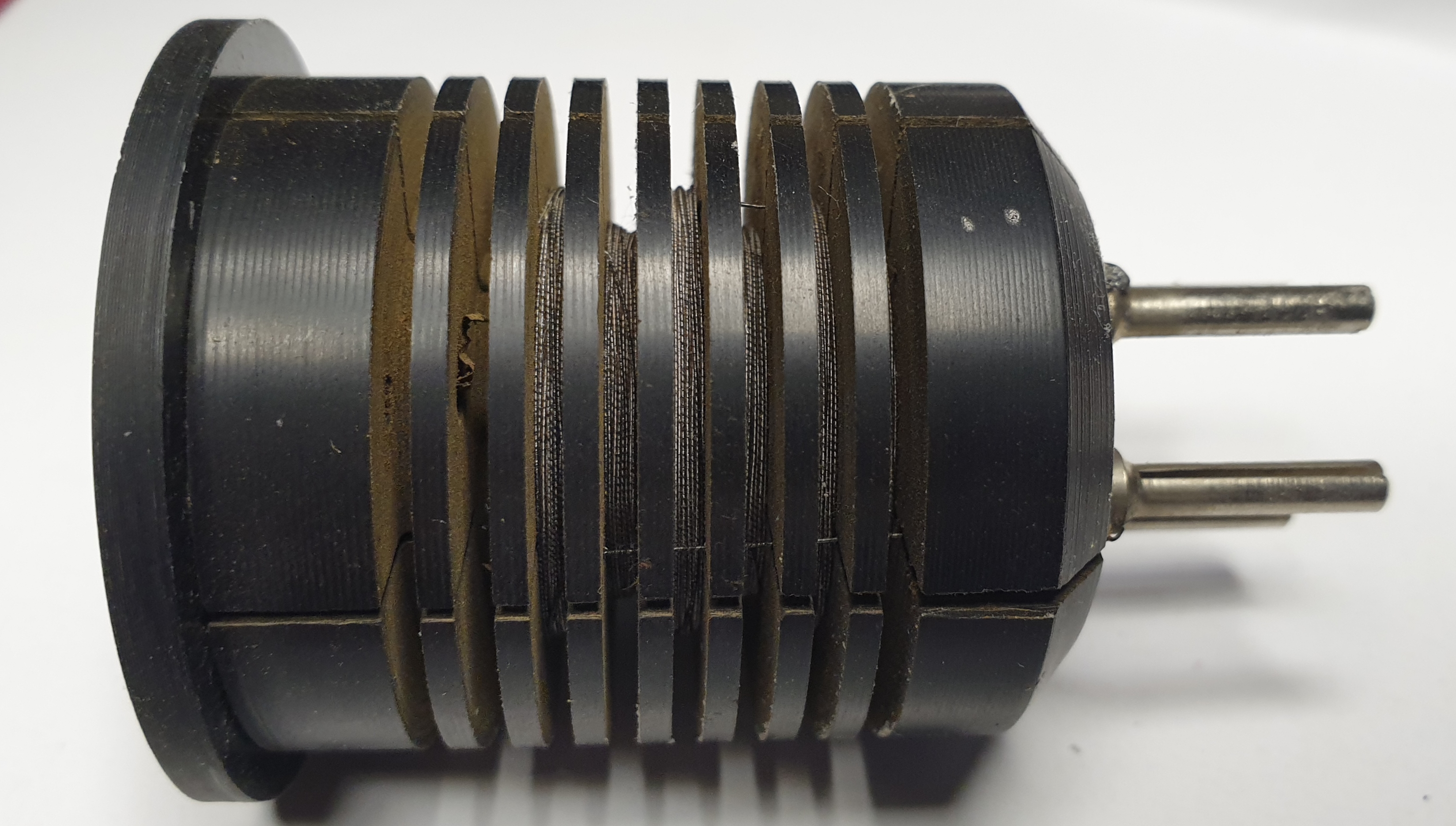 Voici des photos détaillées des bobinages A.L. dont on a parlé plus haut, c’est un mandrin en ébonite avec 8 gorges, le même est utilisé pour les transfos MF.
