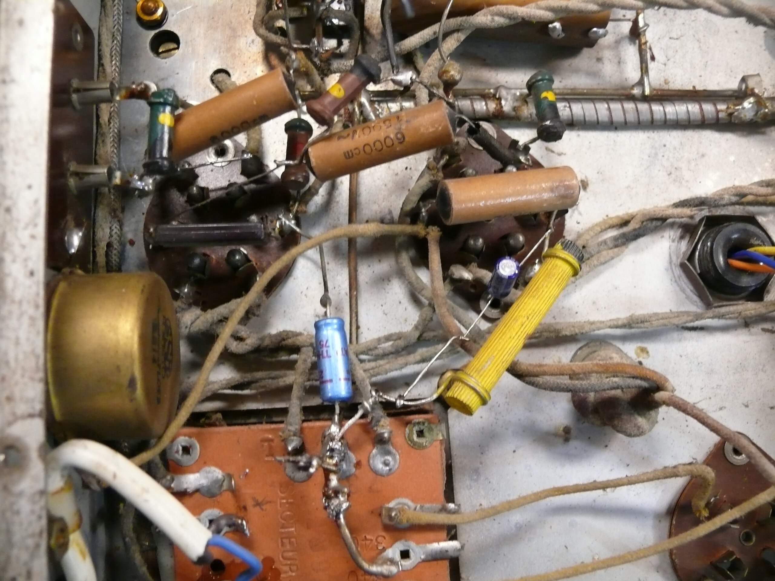 il y avait un 2x30 µf en filtrage . Il semble qu’il ait été mis lors d’un premier dépannage. Normalement c’est trop pour une 80 .. Pocnet dit 10µf en tête. Le second dépanneur lui a mis un 8µf c’est plus logique … Bon mais il est sec archi sec.