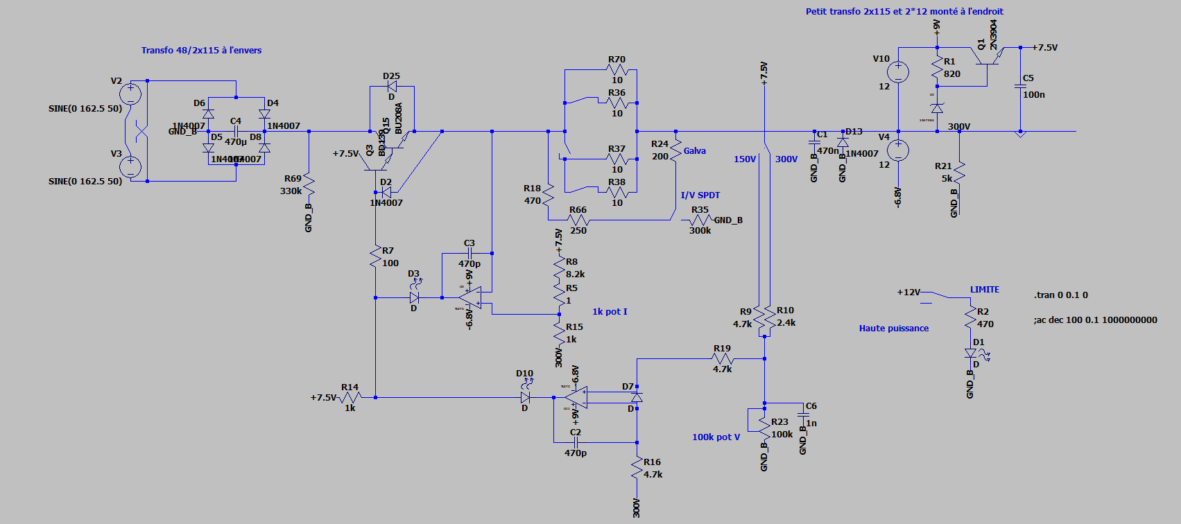 En clair une petite alim 24V référencée sur le 300V alimente un AOP qui permet soit la régulation en tension, soit en courant par une porte OU à diode. Enfin, un transistor BU208A laisse passer plus ou moins de courant. Il y a aussi un petit circuit qui n’apparait pas sur le schéma pour allumer les ventilo dans le cas ou ça chauffe de trop.