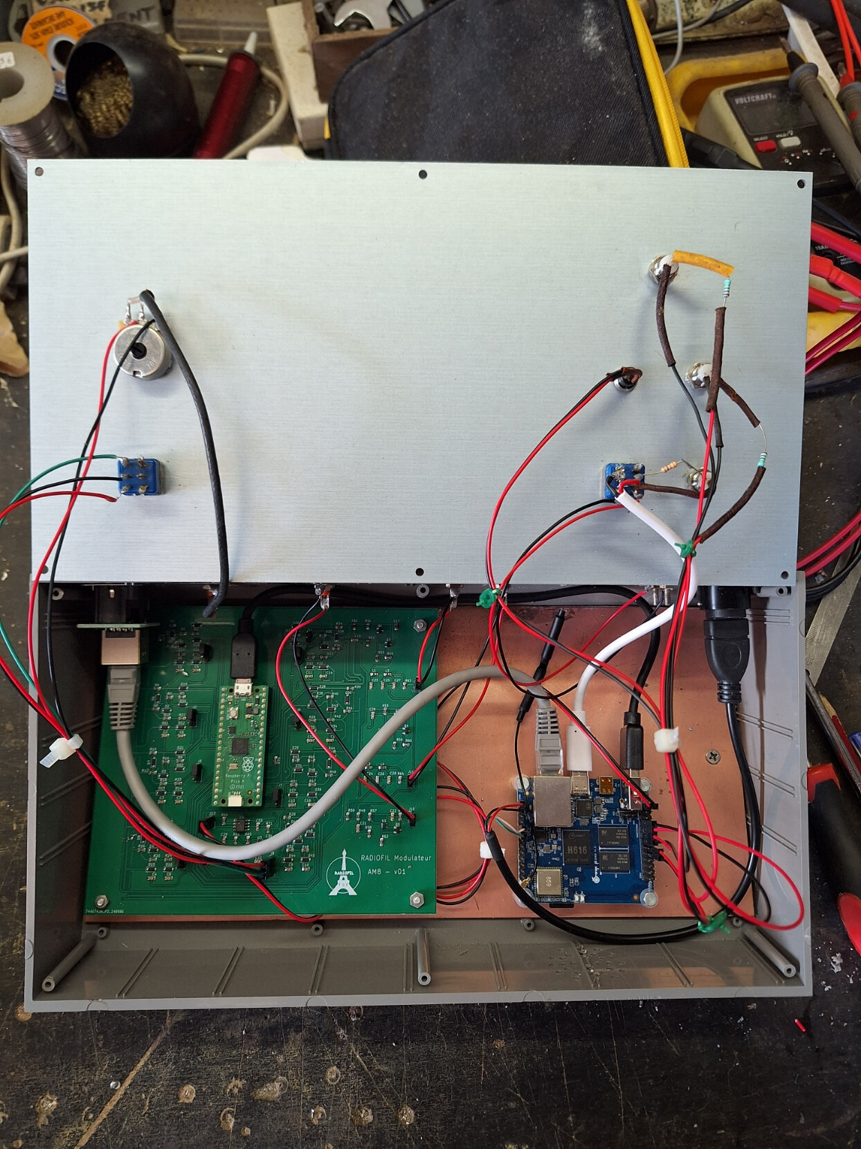 Le montage dans le boîtier est terminé et après un essai, ça fonctionne très bien en radio sur les 4 stations G.O.