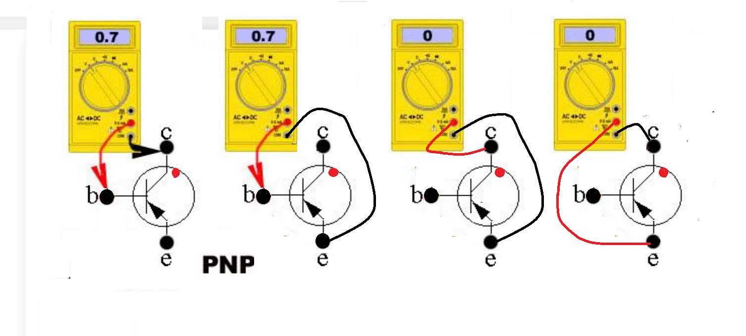 Continuité entre B et C puis B et E dans les deux sens : l’un des deux sens est passant l’autre infini. Selon que le transistor est npn ou pnp.