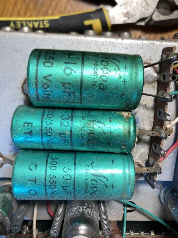 Par exemple le ST 15 possède 4 condensateurs de 20uf-400v, 1 de 50uf 400v (tête de filtrage) 4 condensateurs de 25uf-30V, 1 de 25uf-50v et 1 de 100uf-30V