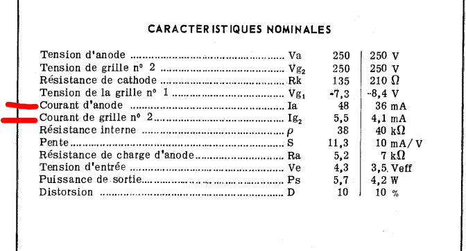 Merci, j’ai rangé les docs de chaque tube avec le brochage et avec ton explication Ik devrait être approximativement 17-18mA la norme serait 40,1-53,5 mA (si j’ai bien suivi !)