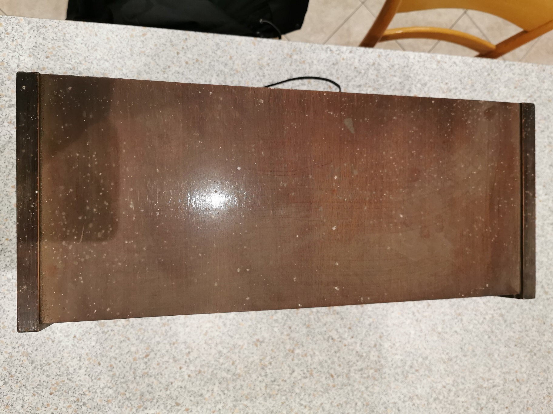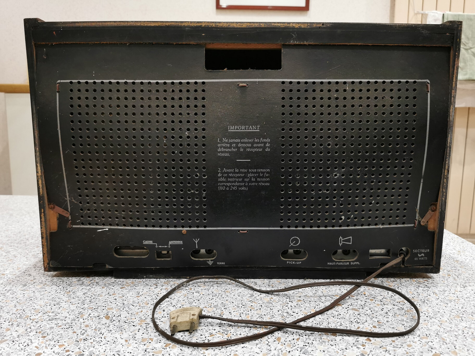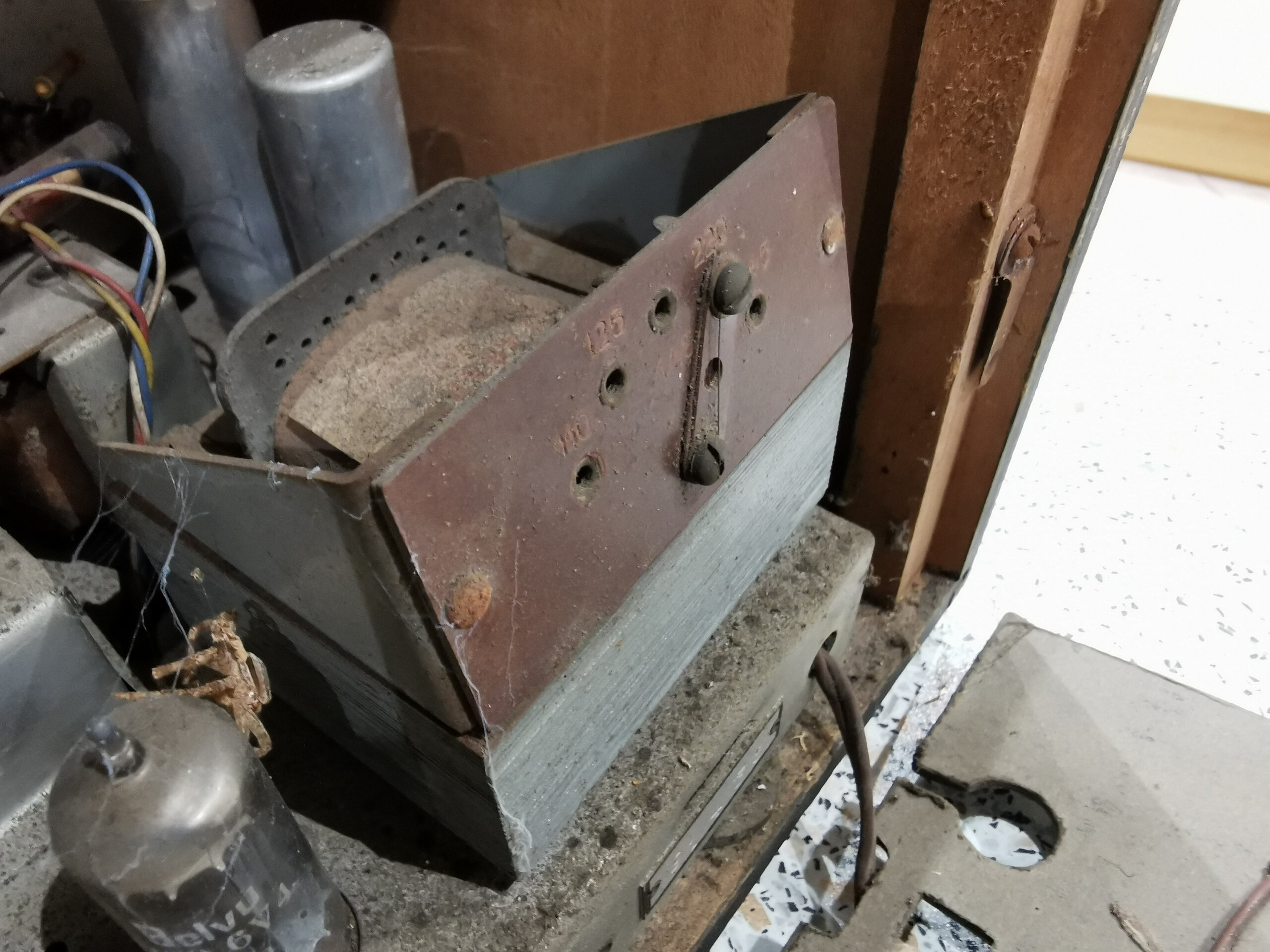 Il y a pas mal de traces de rouille à l’intérieur cependant le HP et sa membrane semblent intacts. Le sélecteur des tensions devra être mis sur 245 Volts. Le plus délicat travail sera de remplacer le tissu de façade qui est bien trop tâché de rouille pour être récupérable .