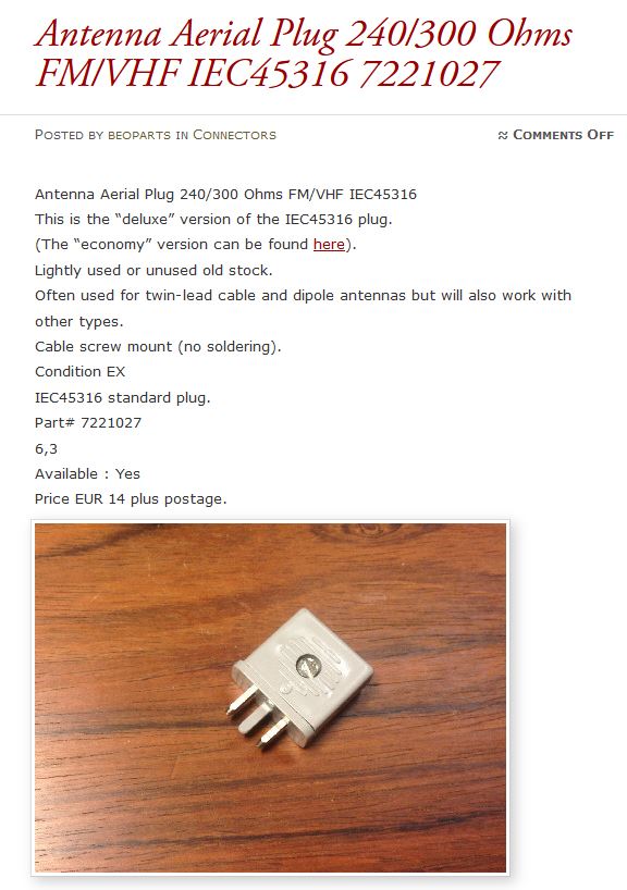 J’ai un grand carton de vieux PCB d’appareils B&O et je crois me rappeler qu’il y a dedans une plaque avec toutes les fiches dont une fiche antenne 300 ohms rectangulaire. Si ça t’interesse je peux fouiller avec la lampe frontale…