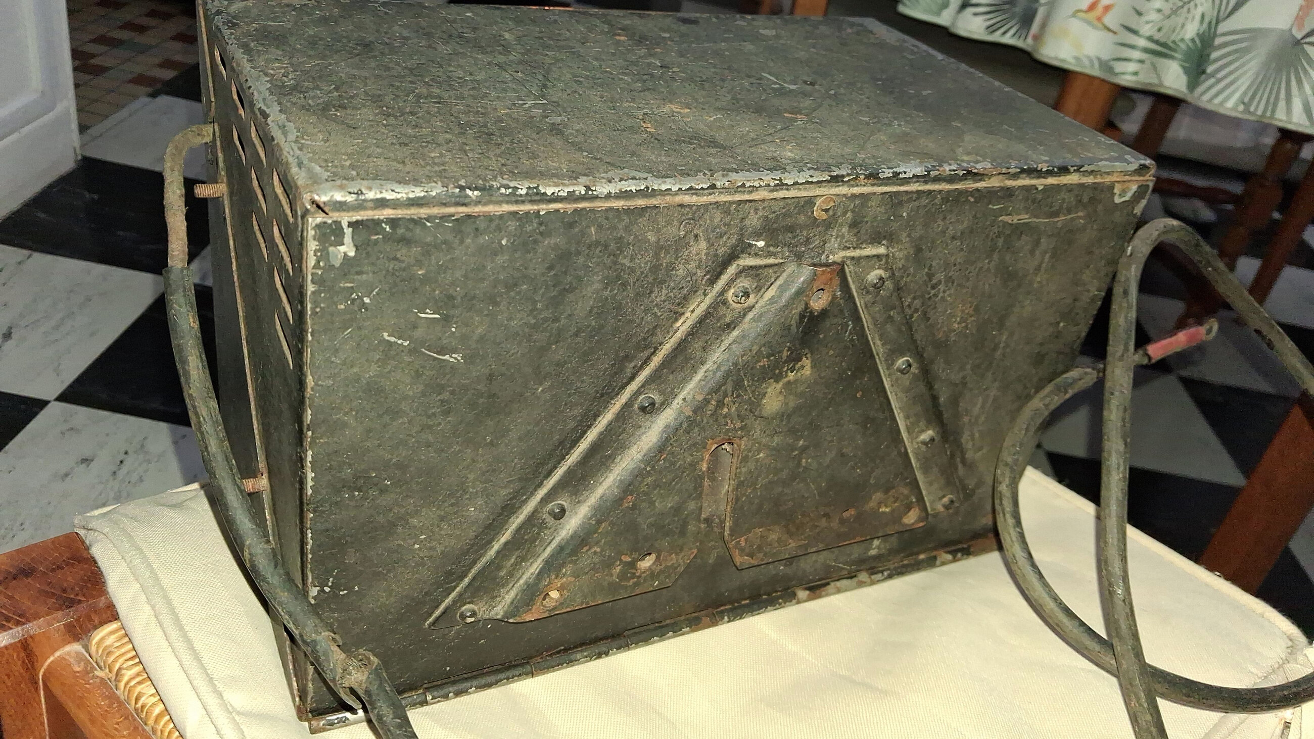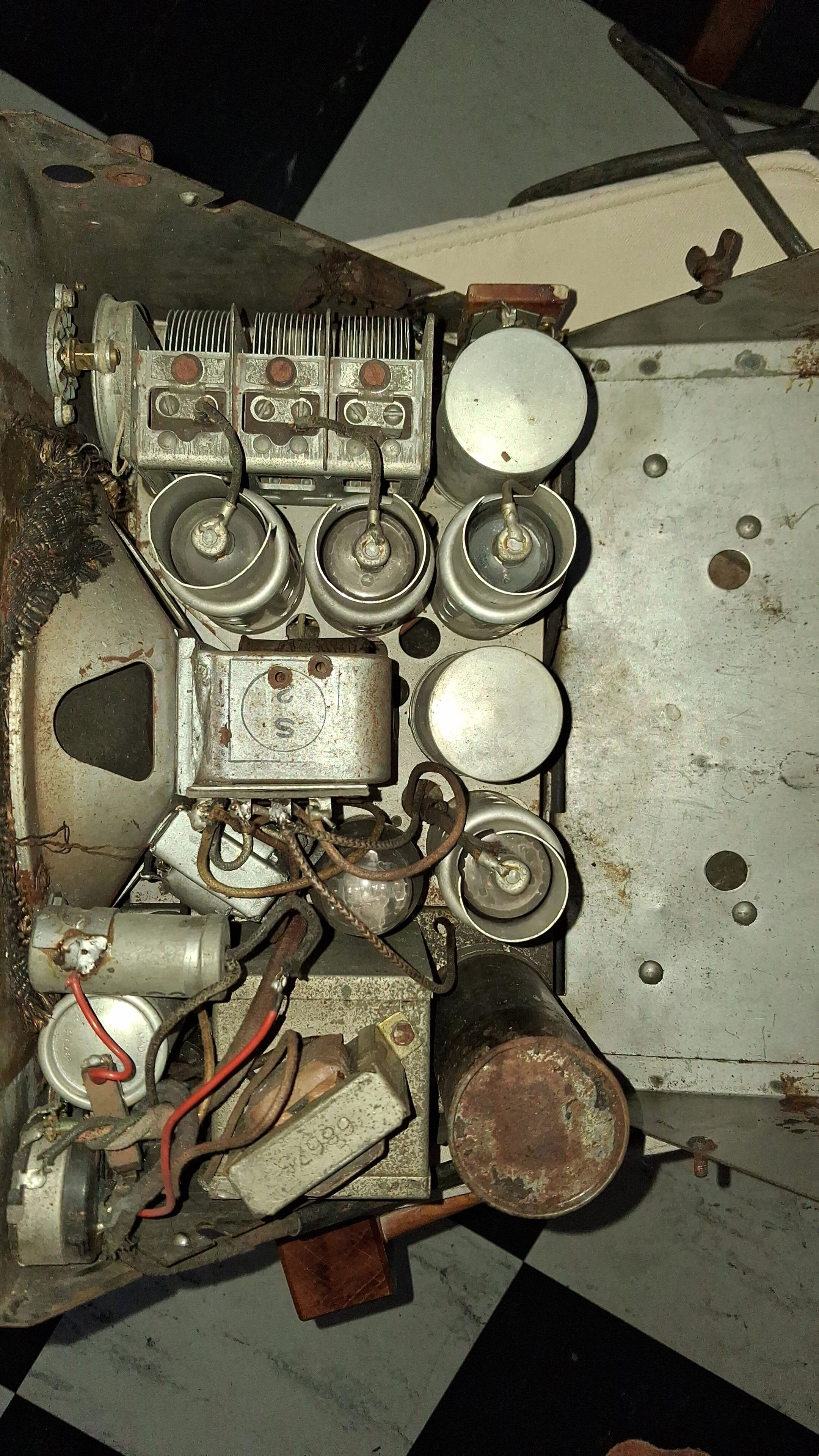 Les deux cornières en triangle font penser qu’il devait se bloquer sur un support, peut-être à bord d’un véhicule. Peut-être une radio pour écouter Glenn Miller en PO afin de remonter le moral des troupes. Ou, sur le territoire US, recevoir les fréquences d’urgence aux deux fréquences de la gamme PO ?
