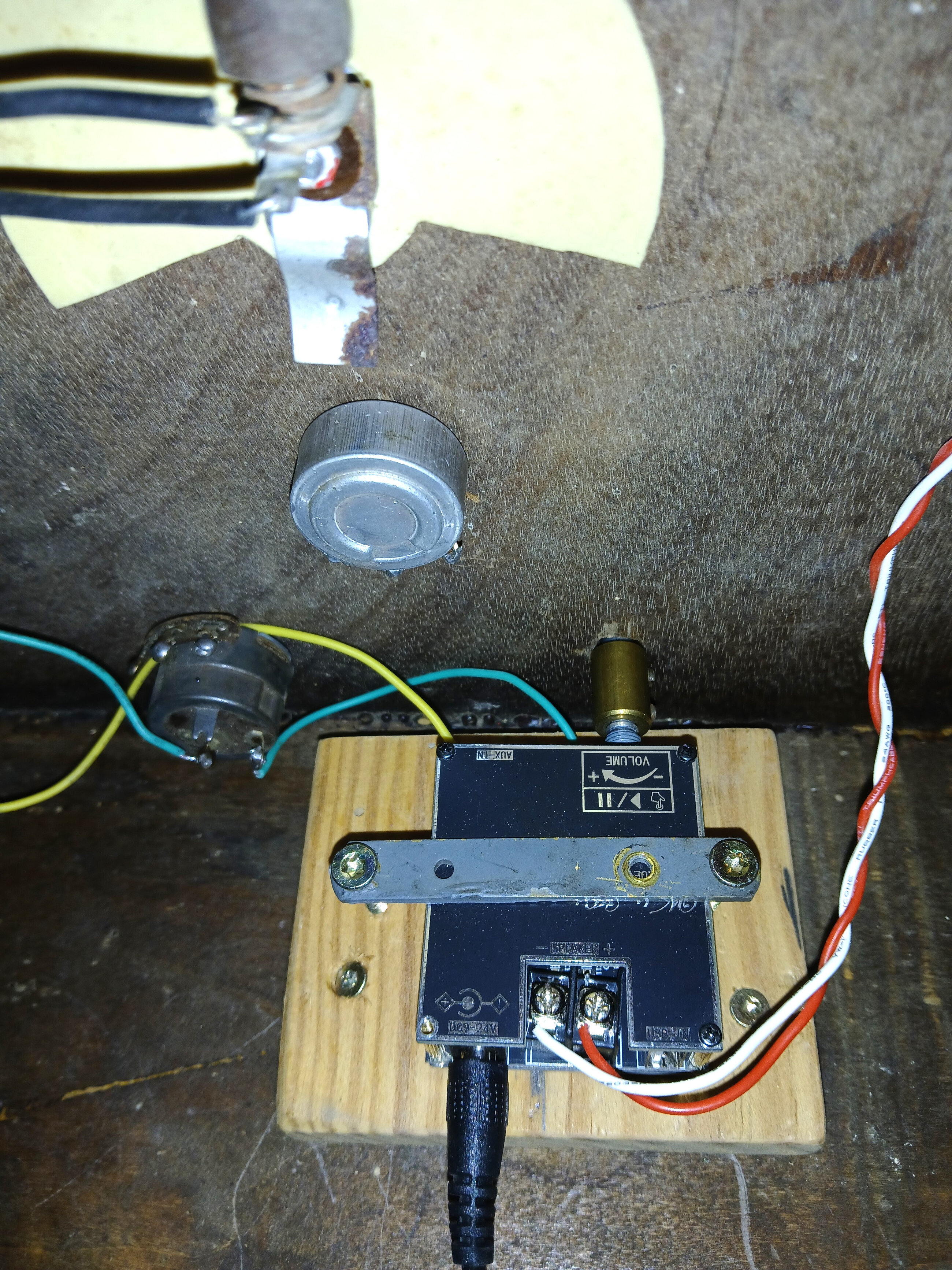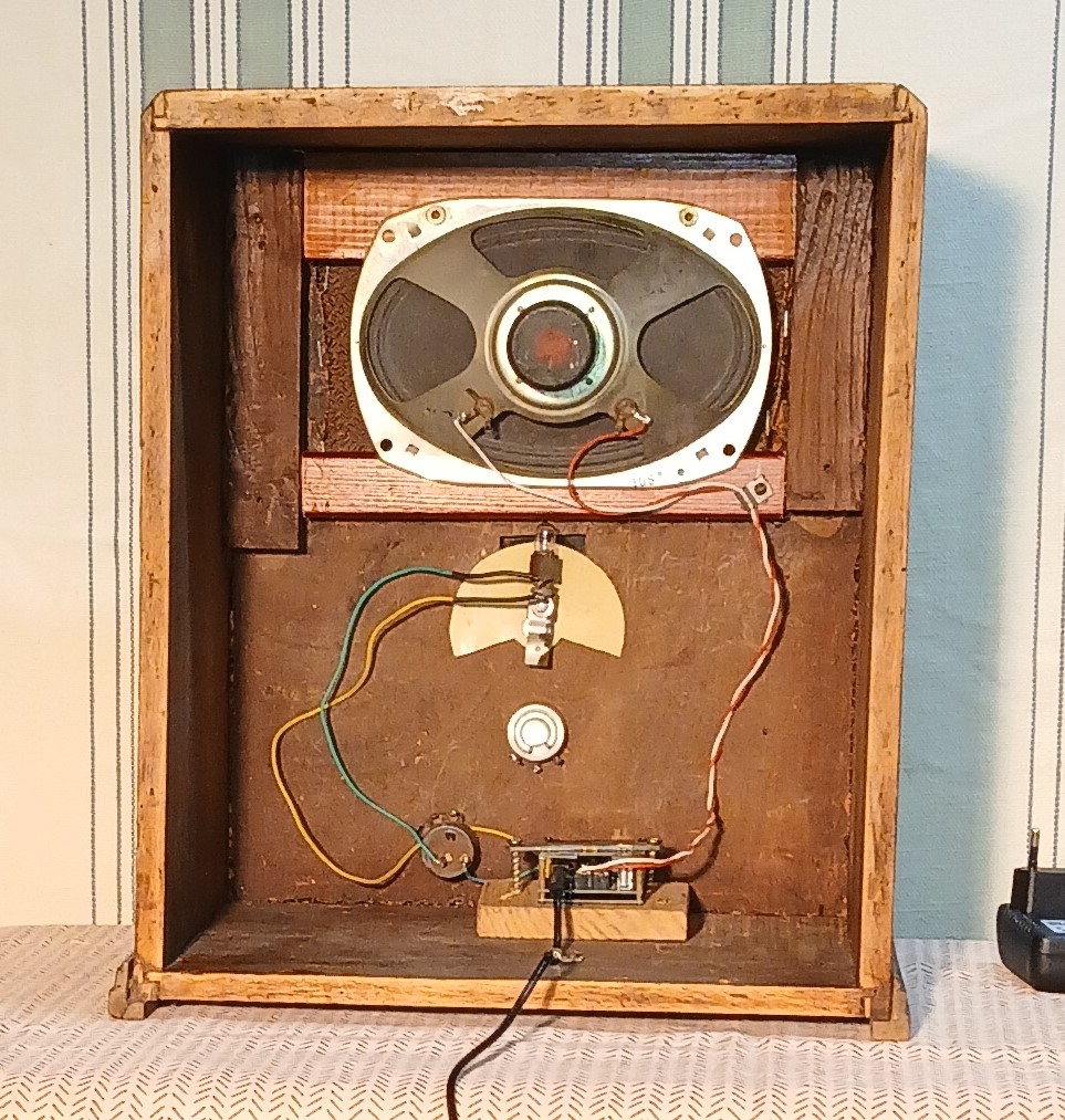 une caisse orpheline, un ampli bluetooth ZK-301 30W a 4.5 euros, des pièces récupérées , une réalisation sans prétention et ça marche.