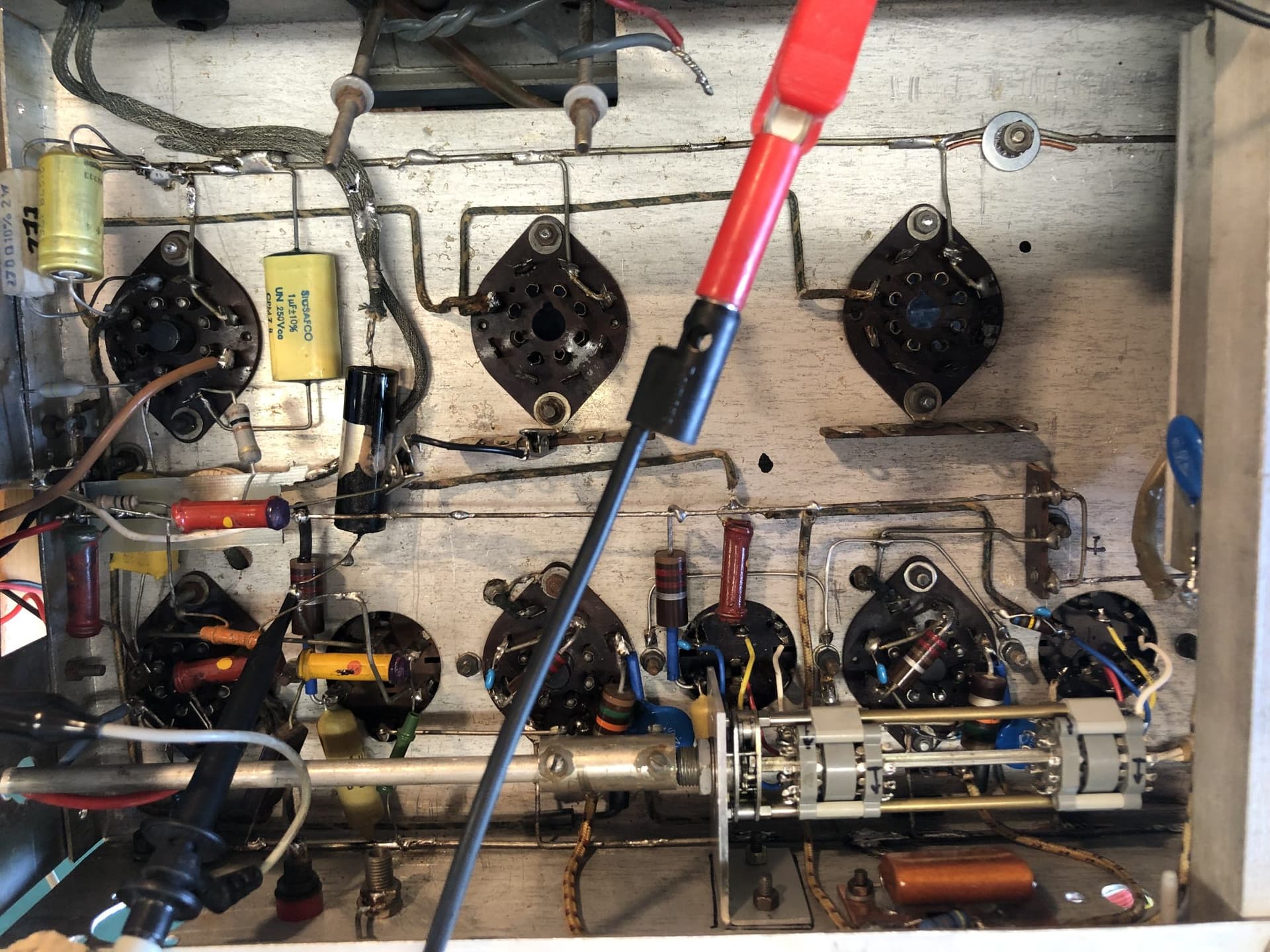 Je ne résiste pas à mettre cette vidéo très courte où je défile le rotacteur de sélectivité maxi à la plus large. J’en ai bavé pour y arriver, noyaux bloqués et un mica dans les choux. Il y a plein de prises intermédiaires sur ces modèles de FI, apparemment il s’agit des supersonic (8 broches!)