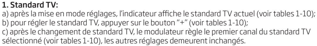 La plupart des modulateurs sont faits pour la norme européenne B/G (modulation vidéo négative et son FM), cela ne convient pas pour un TV uniquement norme française.