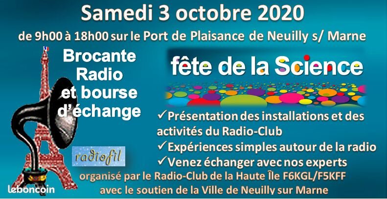 Pour la 8ème année consécutive, le Radio-Club de Neuilly sur Marne organise en association avec Radiofil une « Brocante Radio » le samedi 3 octobre sur le Port de Plaisance de Neuilly sur Marne (93330) de 09h00 à 18h00. Comme l’an dernier, nous avons voulu élargir l’audience de cet évènement en le jumelant avec la Fête de la Science qui se déroule la même semaine sur toute la France.