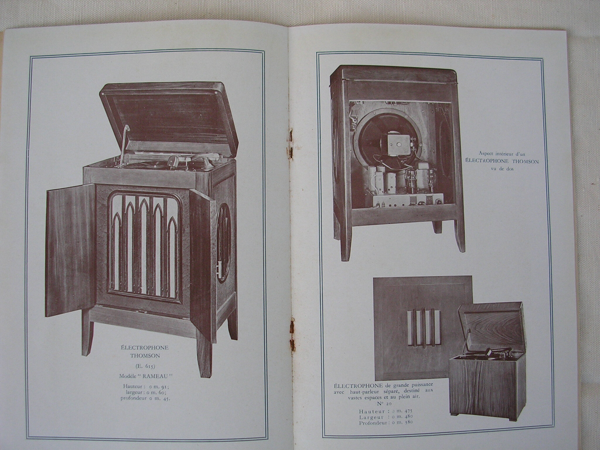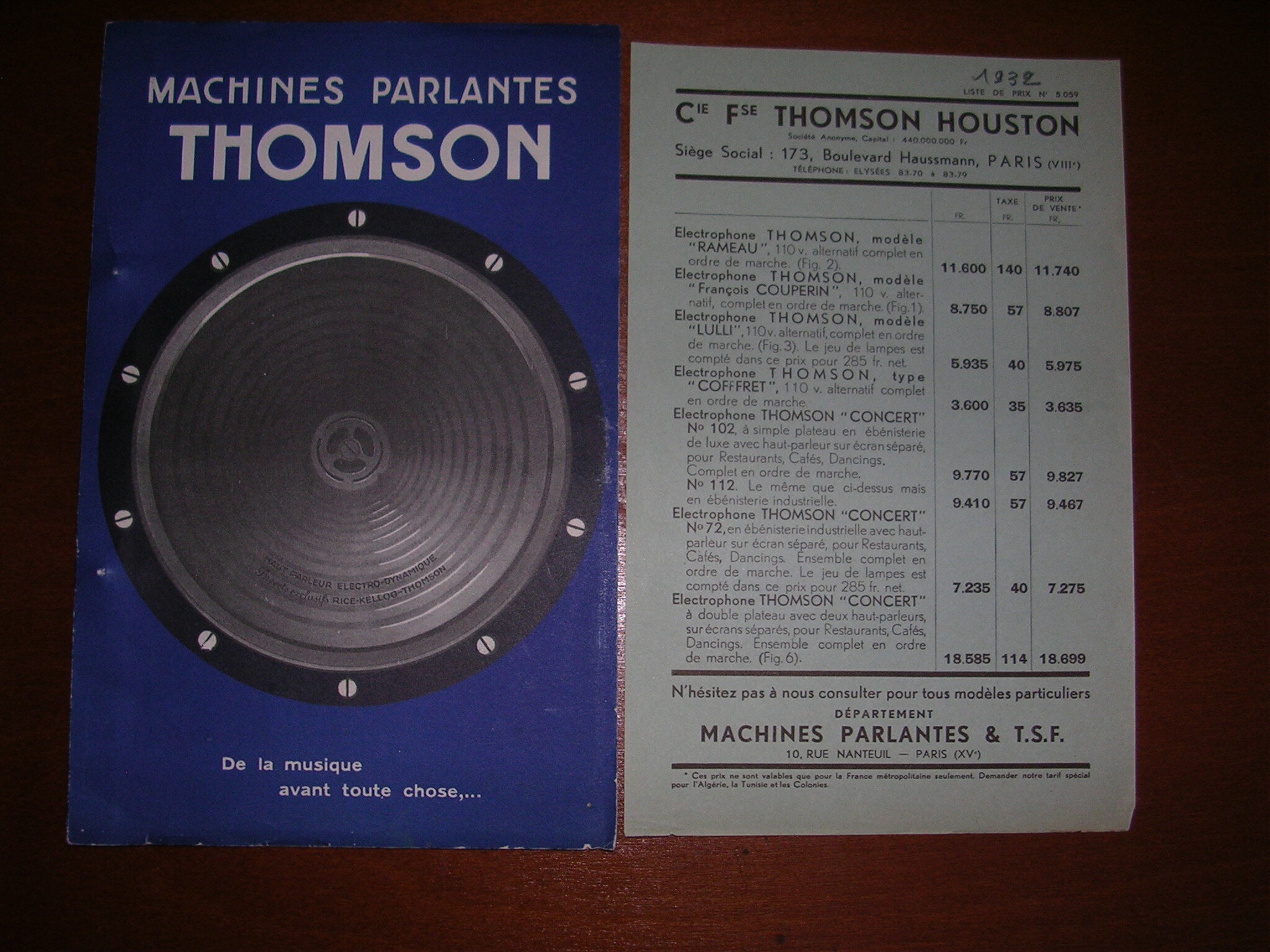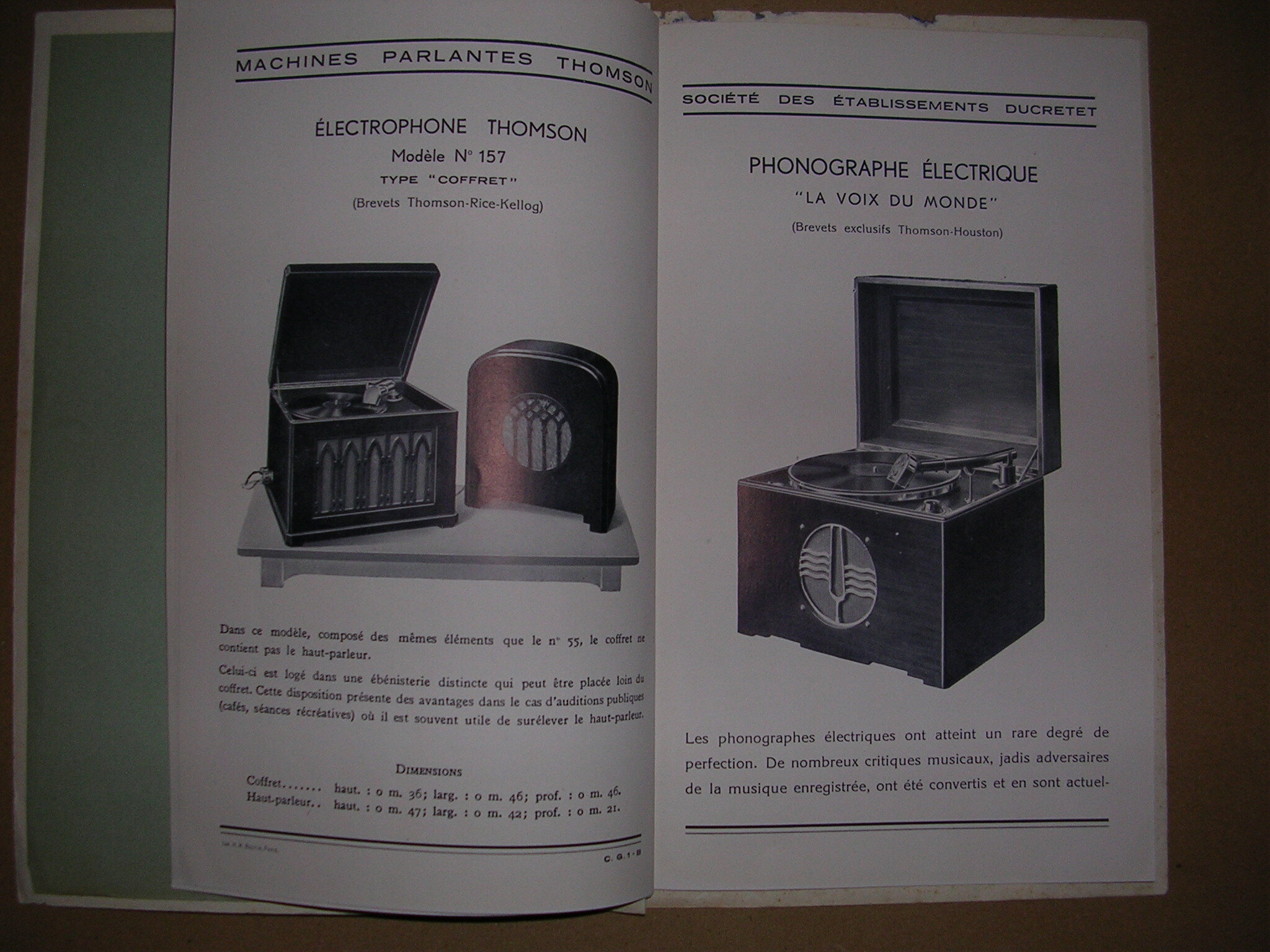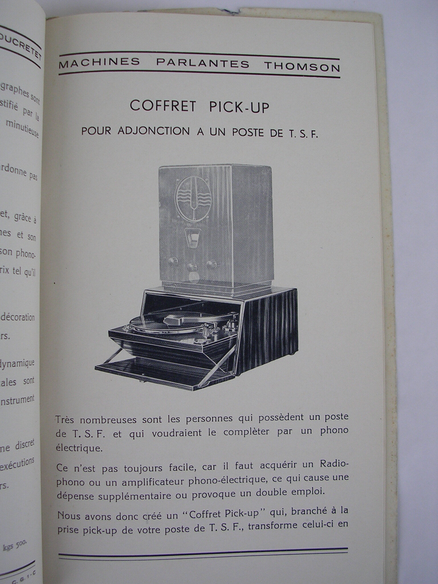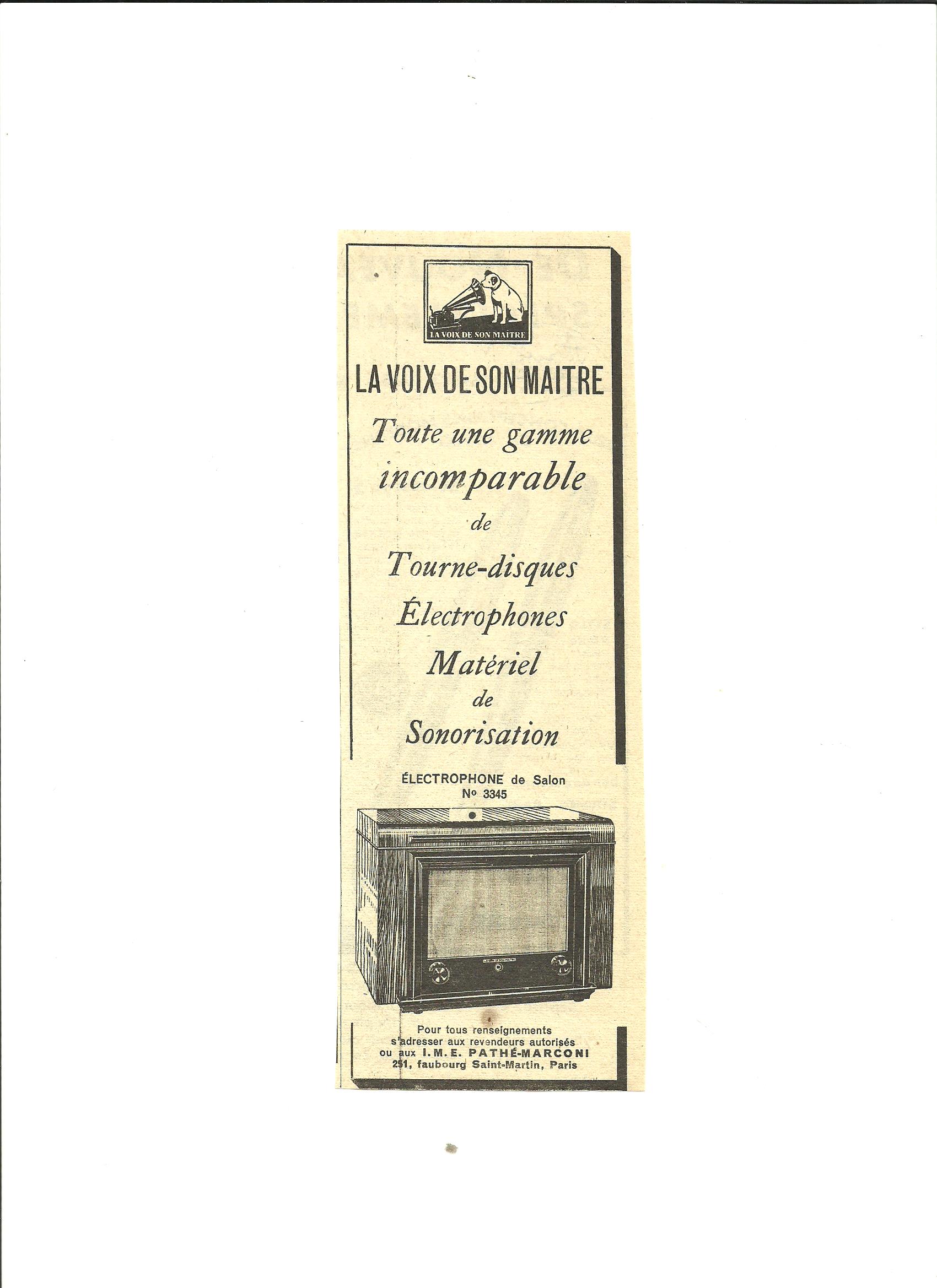 Un feuillet publicitaire présentant les productions des " Industries Musicales et Electriques Pathé-Marconi " ( peut-être début 1939 ), vendues sous les marques " G. Marconi " et " La Voix de son Maître ", dont certains modèles sont équipés du tout nouveau pick-up léger, muni d’une aiguille ( miniature ) permettant une centaine d’auditions :