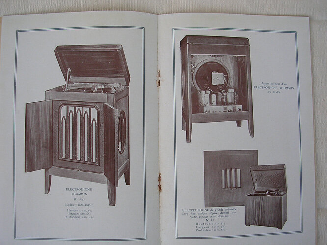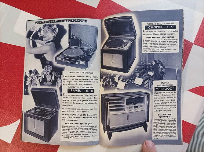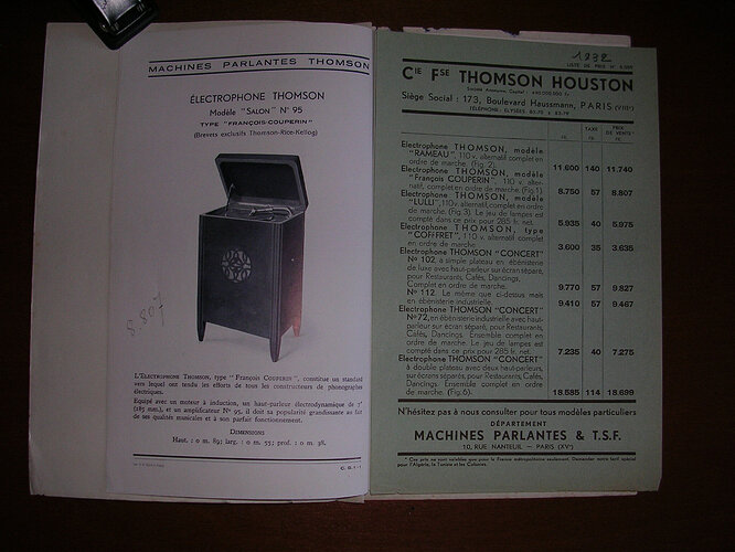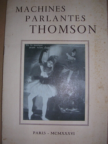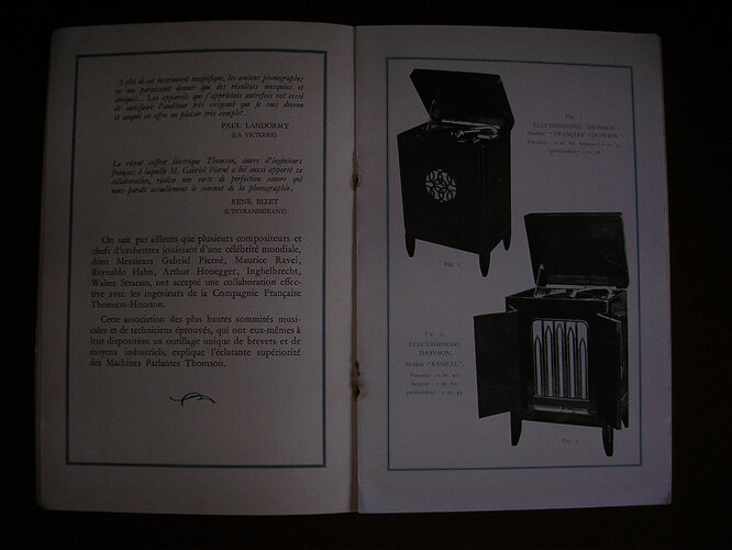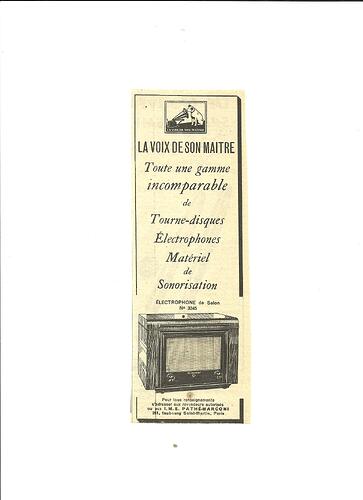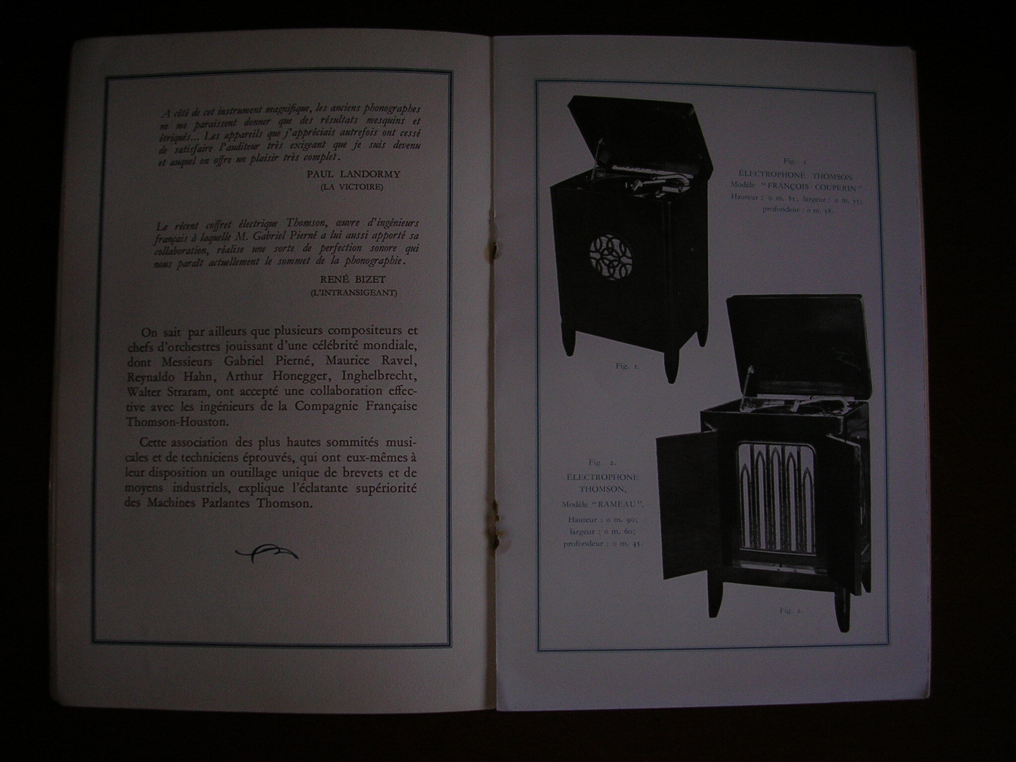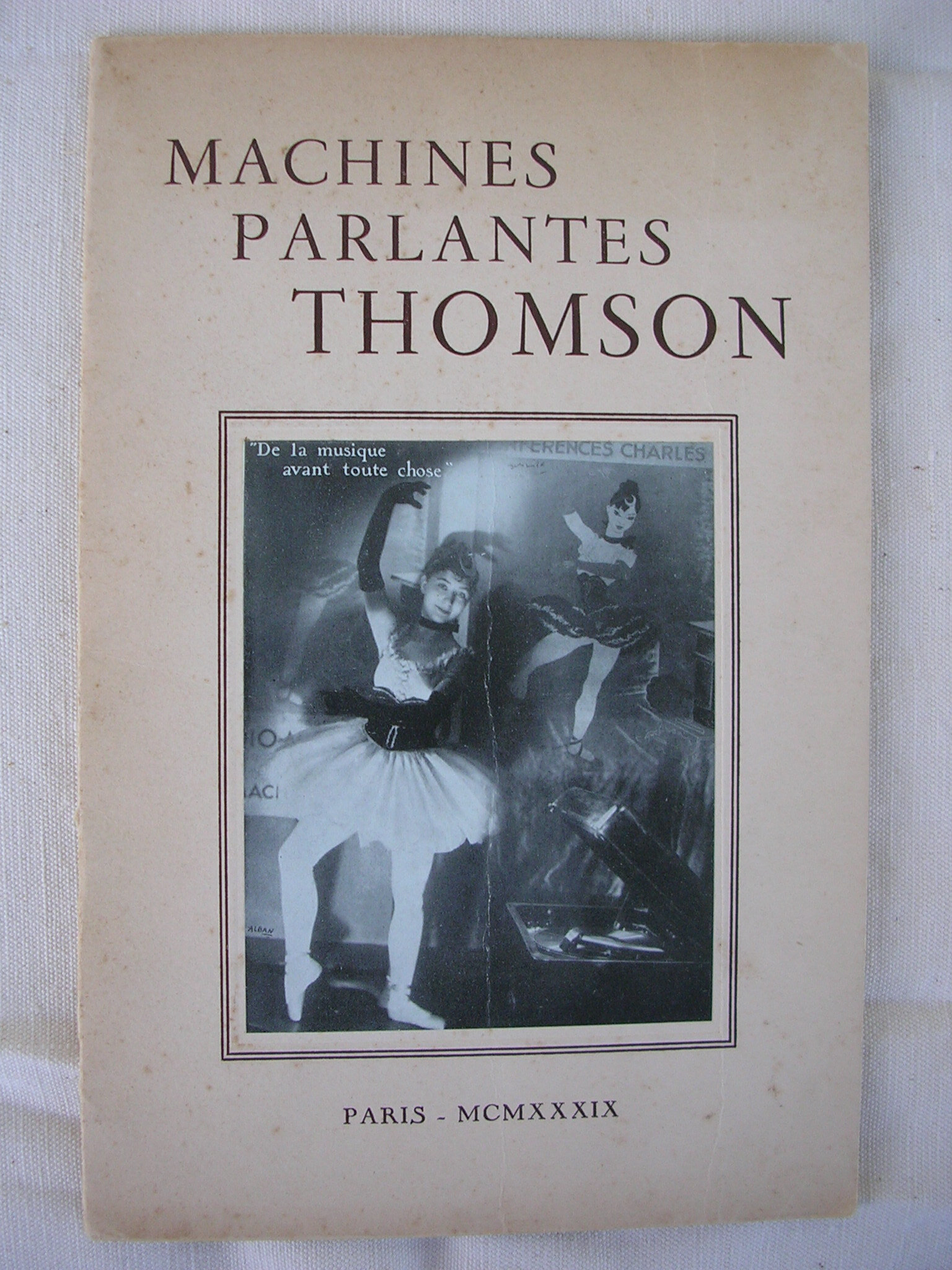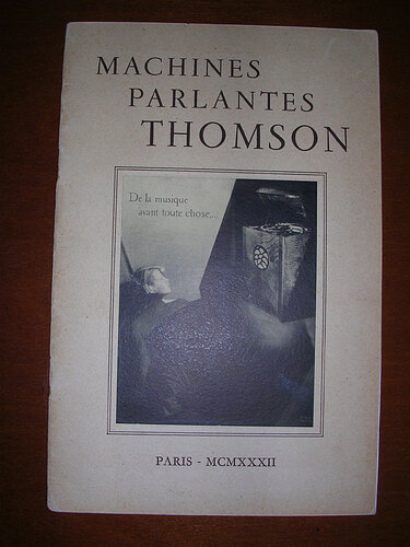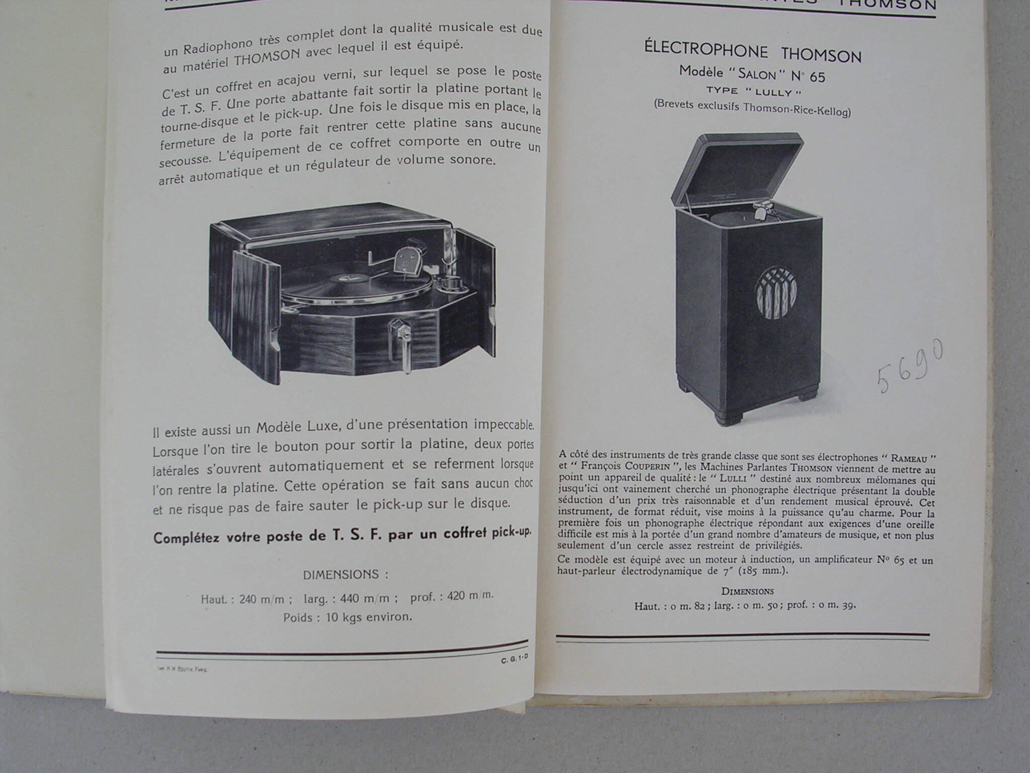 Un feuillet publicitaire présentant les productions des " Industries Musicales et Electriques Pathé-Marconi " ( peut-être début 1939 ), vendues sous les marques " G. Marconi " et " La Voix de son Maître ", dont certains modèles sont équipés du tout nouveau pick-up léger, muni d’une aiguille ( miniature ) permettant une centaine d’auditions :