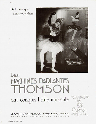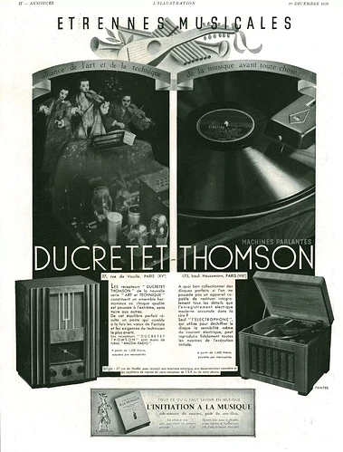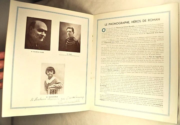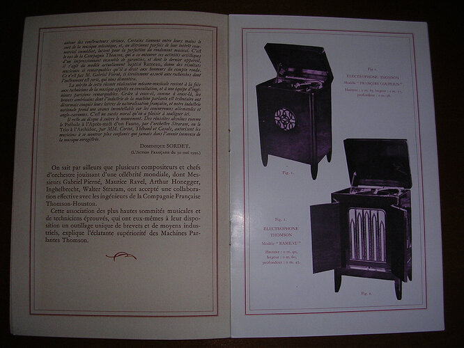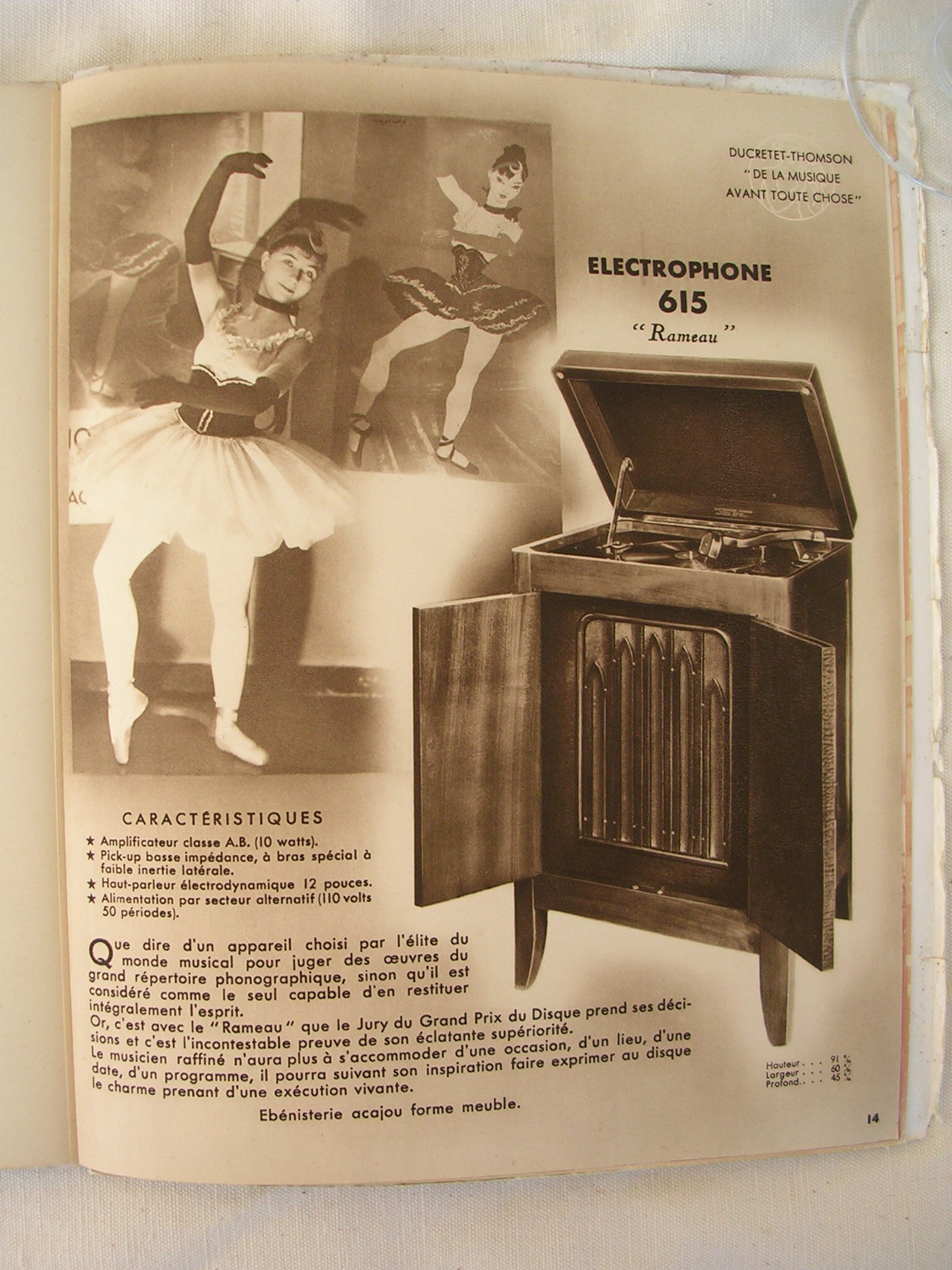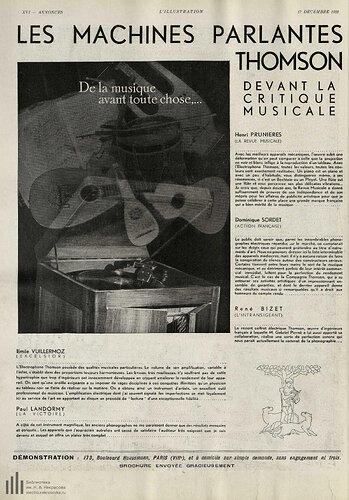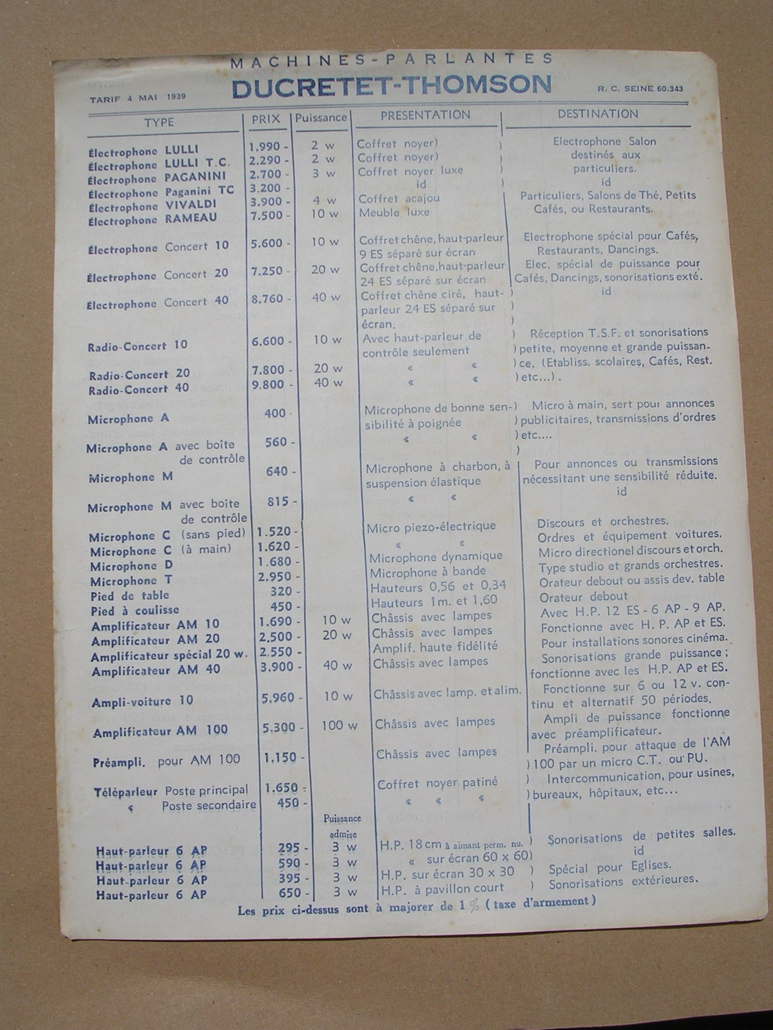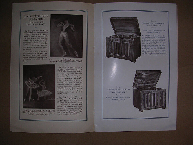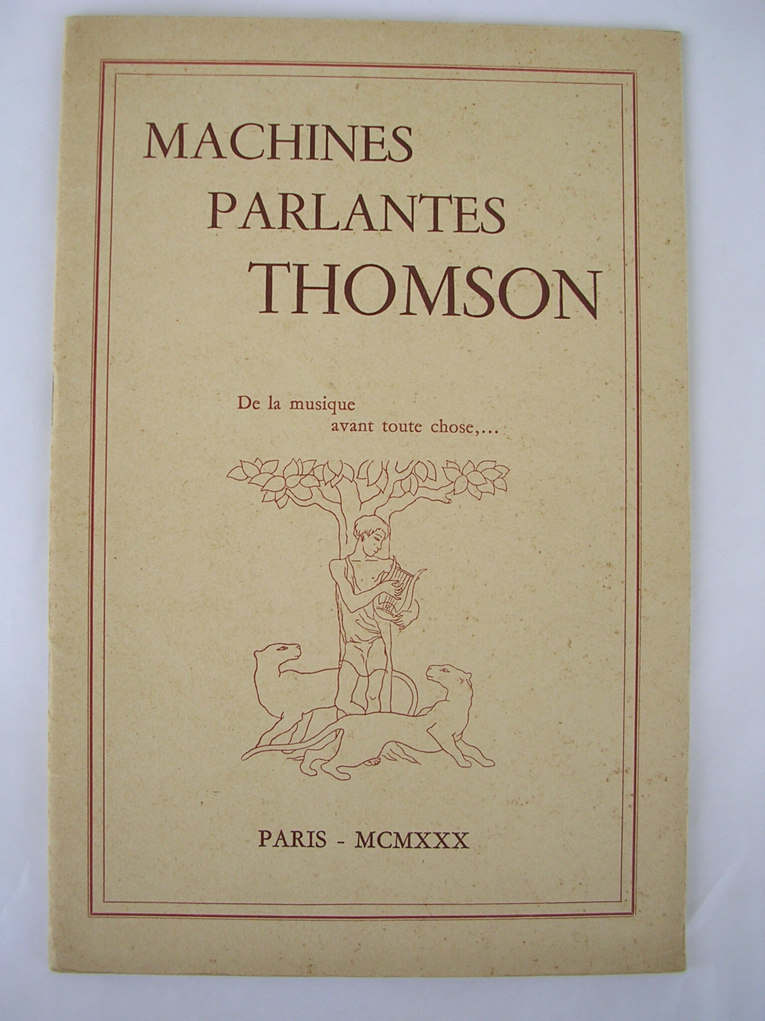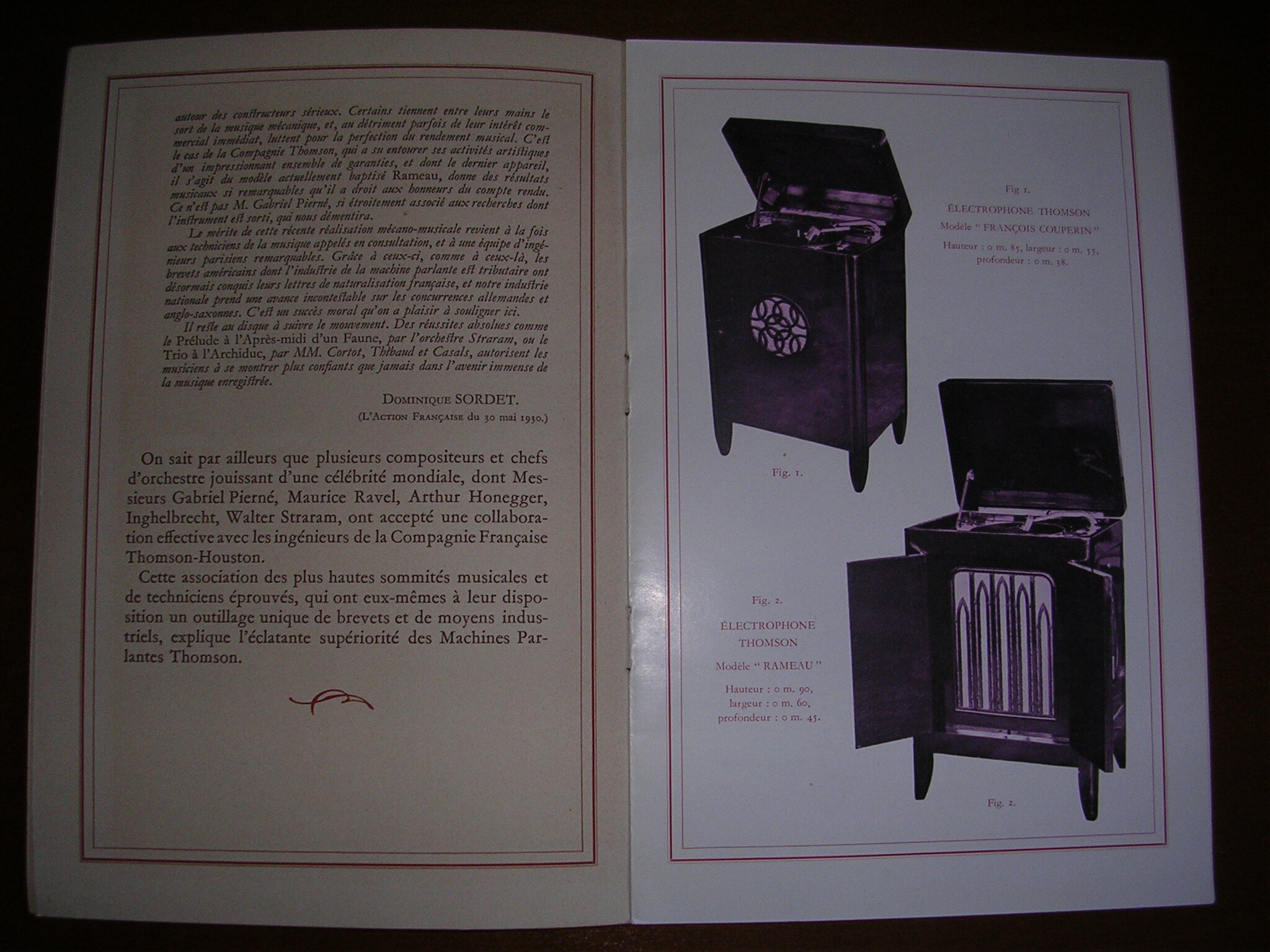 Un feuillet publicitaire présentant les productions des " Industries Musicales et Electriques Pathé-Marconi " ( peut-être début 1939 ), vendues sous les marques " G. Marconi " et " La Voix de son Maître ", dont certains modèles sont équipés du tout nouveau pick-up léger, muni d’une aiguille ( miniature ) permettant une centaine d’auditions :
