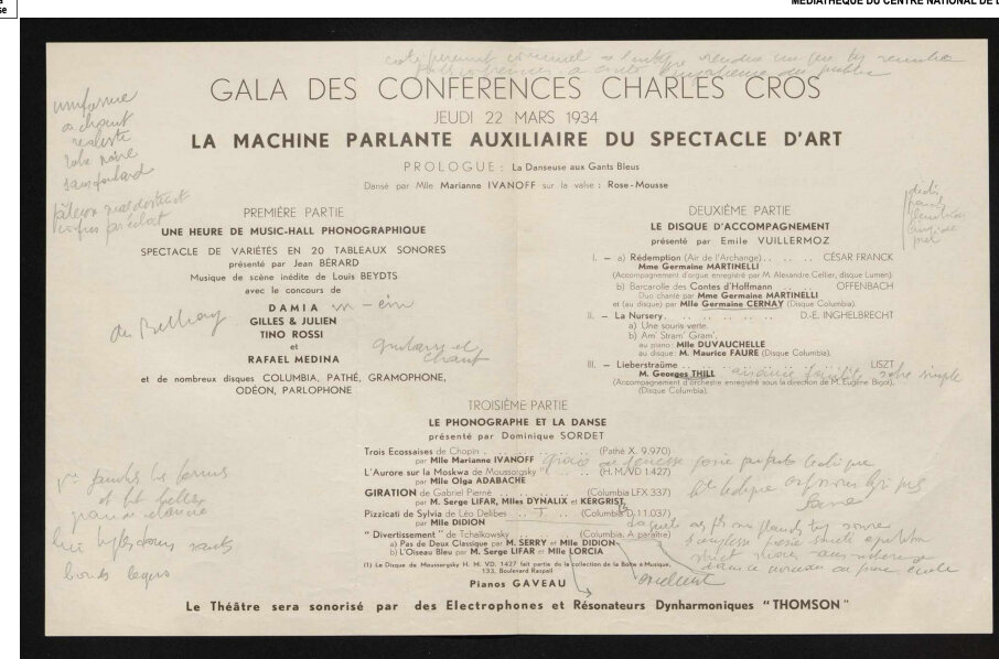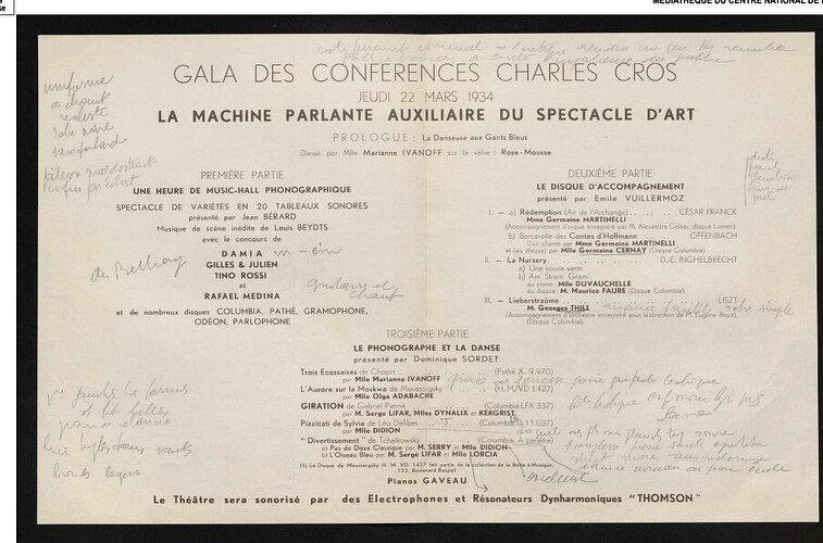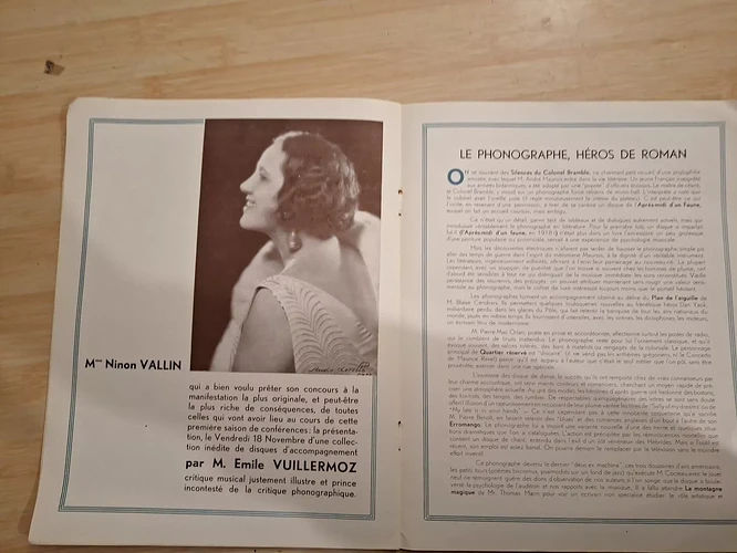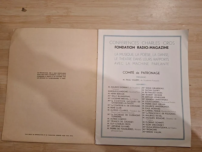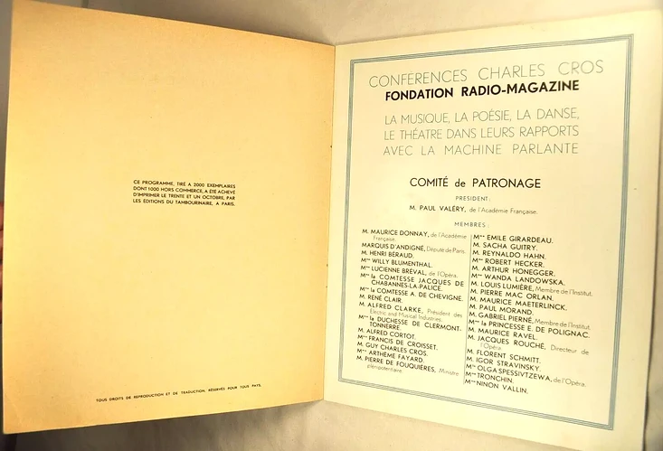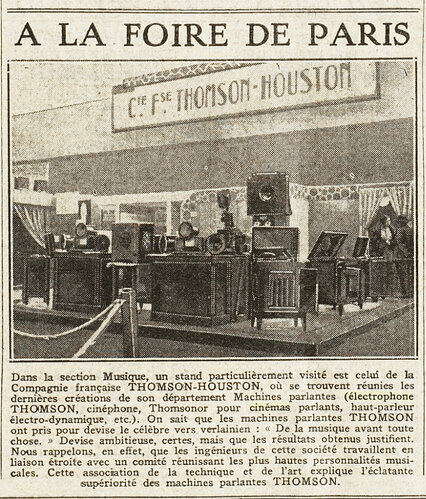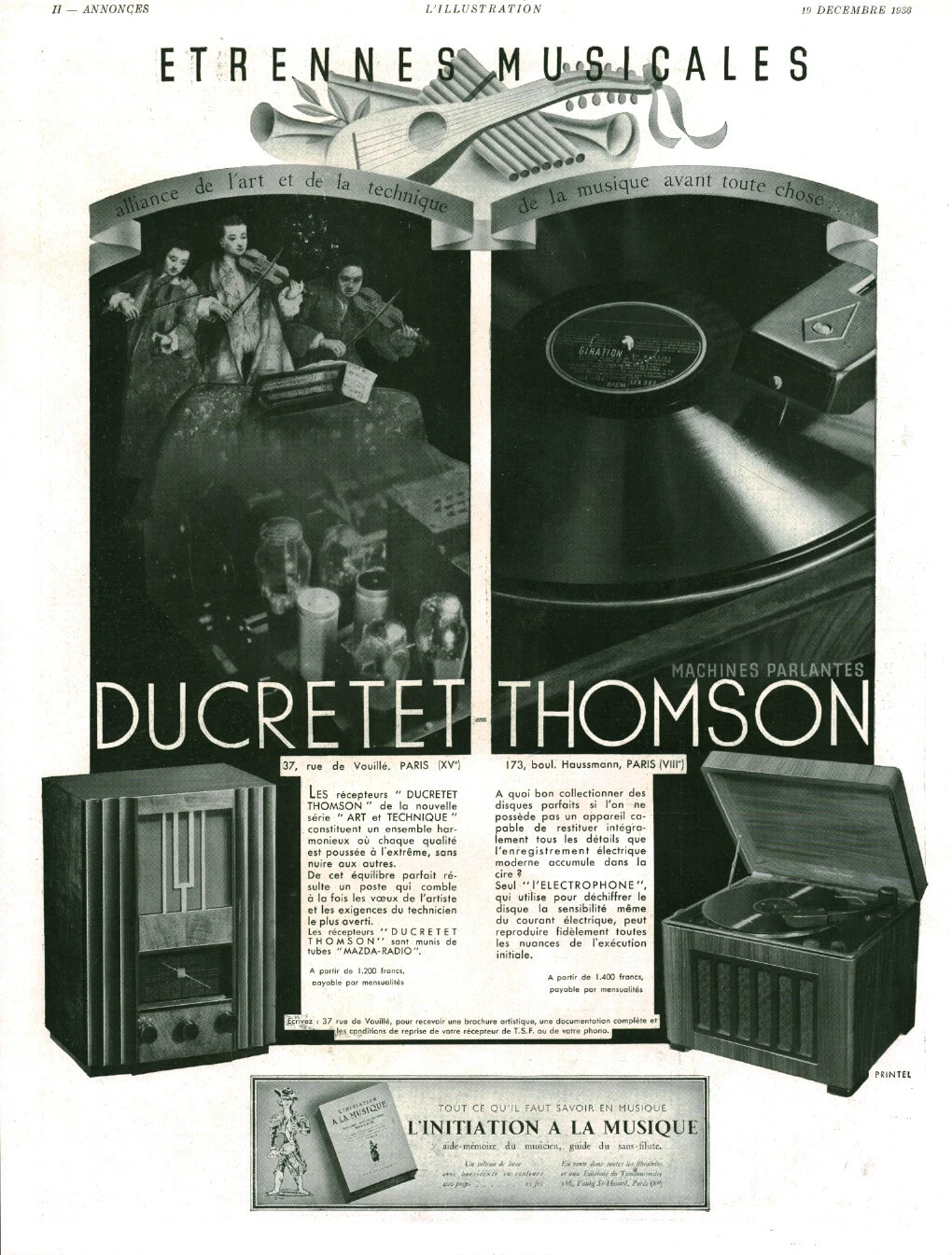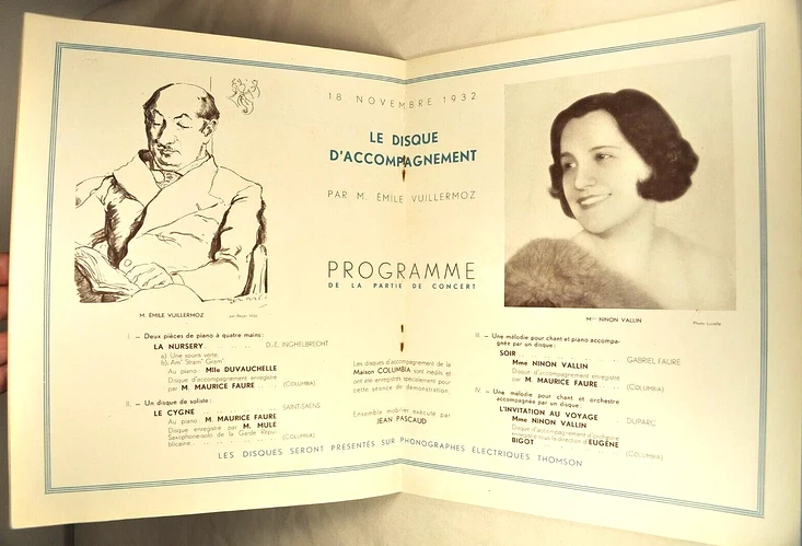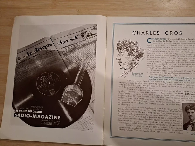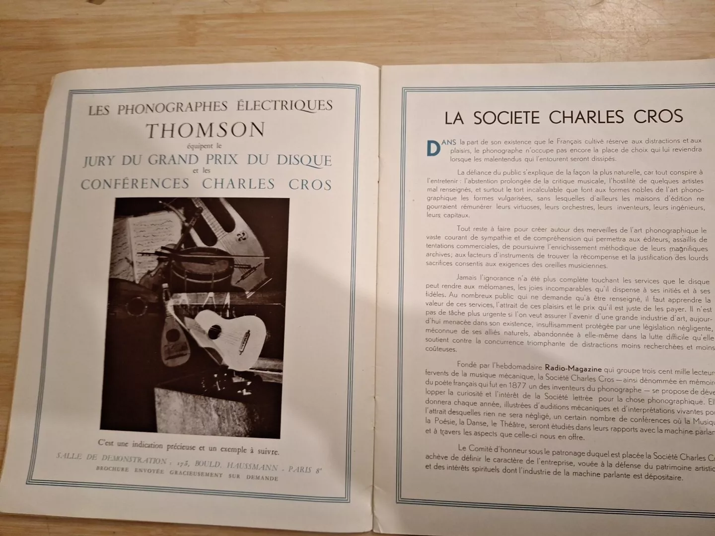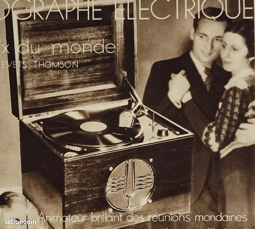 Un feuillet publicitaire présentant les productions des " Industries Musicales et Electriques Pathé-Marconi " ( peut-être début 1939 ), vendues sous les marques " G. Marconi " et " La Voix de son Maître ", dont certains modèles sont équipés du tout nouveau pick-up léger, muni d’une aiguille ( miniature ) permettant une centaine d’auditions :