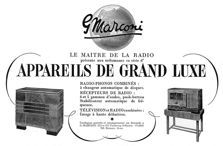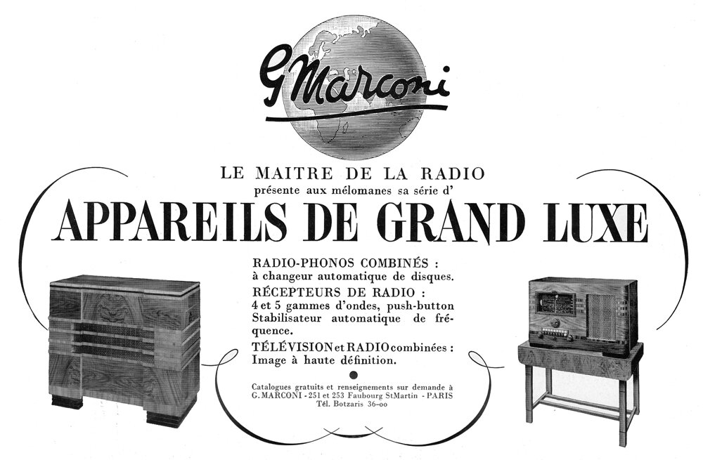 GB: Modèles du fabricant Marconi Co. (Marconiphone, Marconi’s Wireless Telegraph Co. Ltd.), GB (not tubes - see also HMV His Master’s Voice) - www.radiomuseum.org )