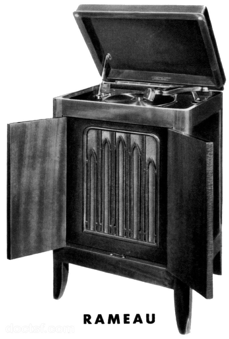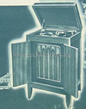 Ce changeur de disques " K3 ", équipé du nouveau pick-up léger His Master’s Voice / H.M.V. " Hyper-Sensitive ", installé dans un meuble radio-gramophone-télévision " Marconiphone Model 703 " :