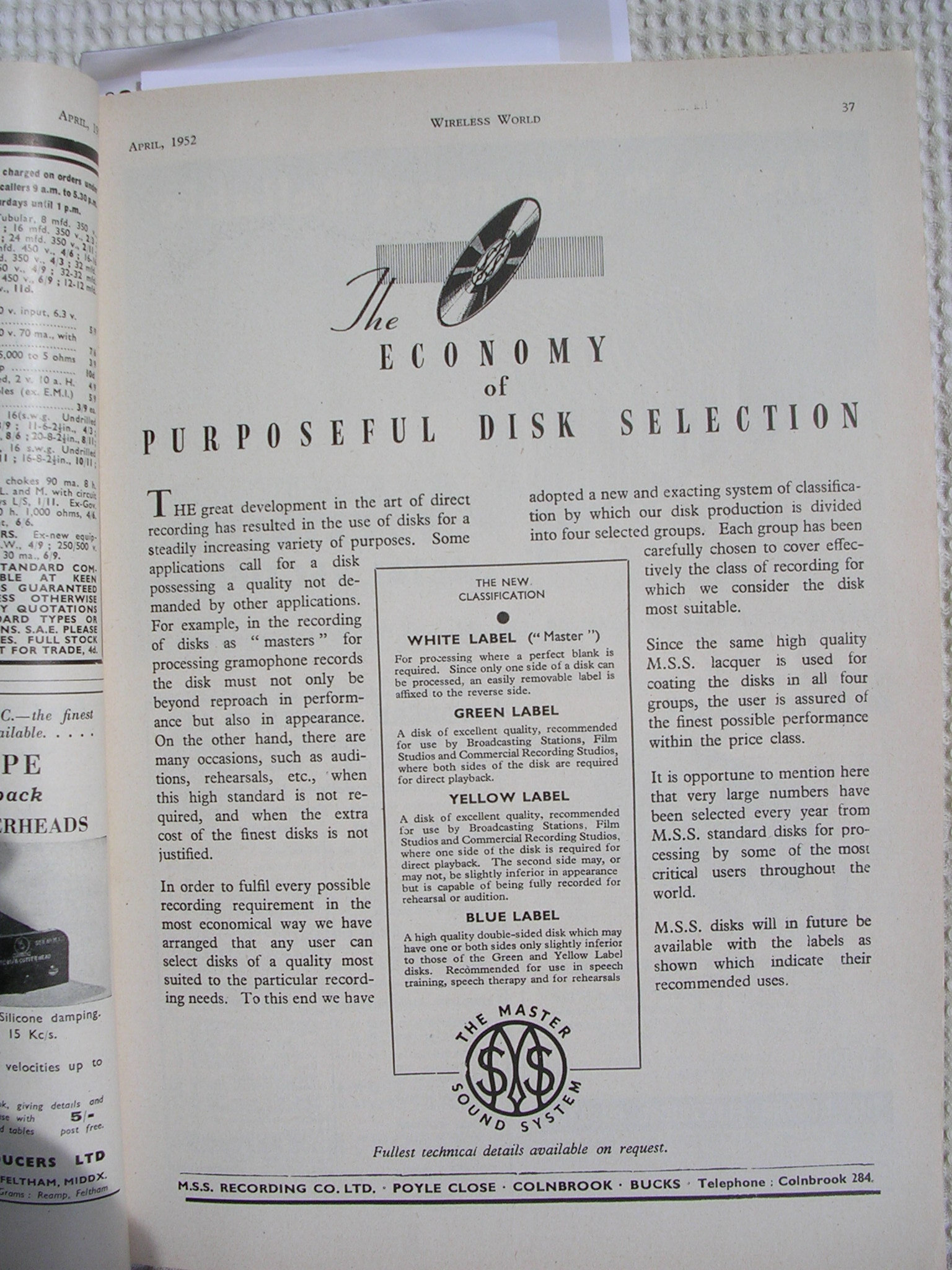 Une publicité parue dans la revue britannique " WIRELESS WORLD " d’avril 1952, page 37, concernant les différents types de disques à graver proposés par la société " M.S.S. ’ THE MASTER SOUND SYSTEM ’ ( ex ’ MARGUERITE SOUND STUDIOS ’ ) RECORDING COMPANY LIMITED " :