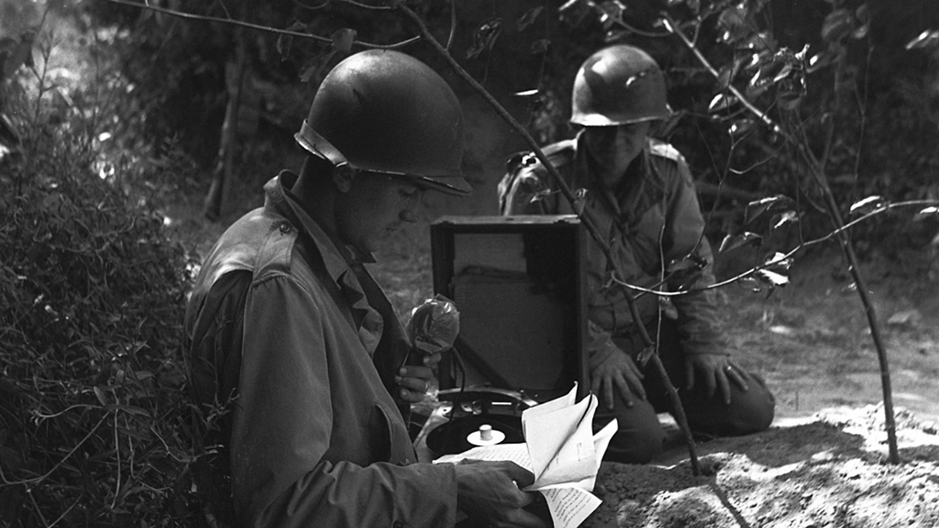 C.D Adamson, engineer correspondent of the BBC War Reporting Unit, with a midget Recorder - Midget recorders, weighing only 35 Ibs, were developed by the BBC for the front-lines. - www.bbc.co.uk
