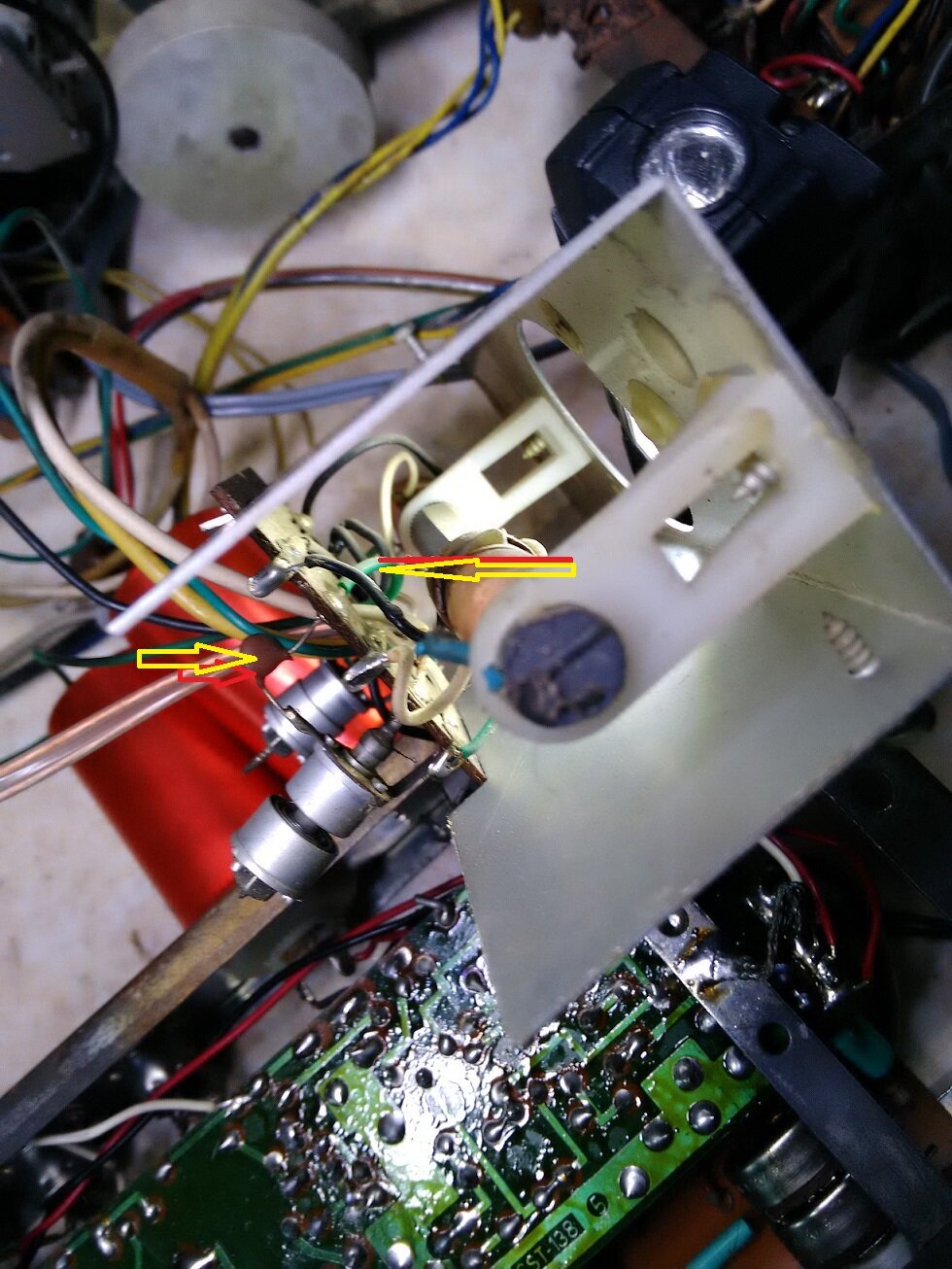 Le problème est le fil vert qui arrive sur le petit condensateur marron et qui est dessoudé à l’autre bout, je pense qu’il va sur l’entrée antenne AM qui est sur le panneau ou sont les sorties hp !