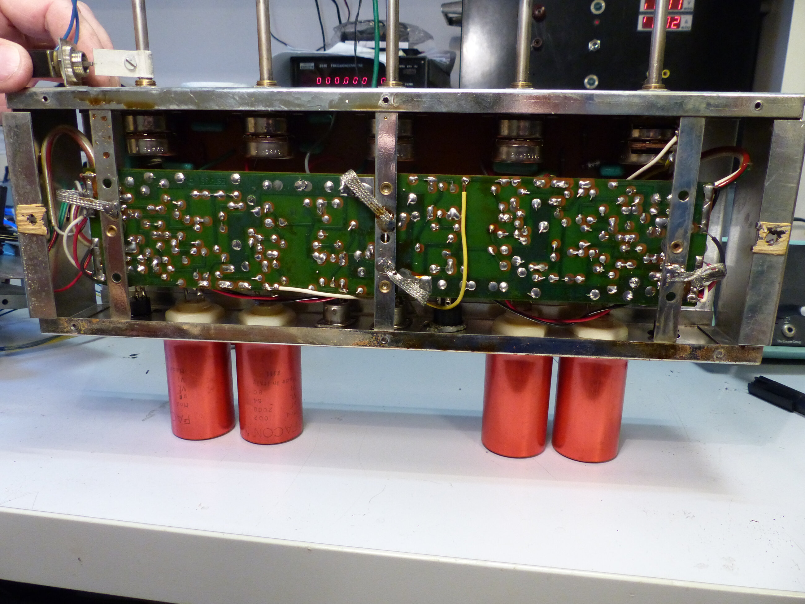 Pour le point sur les capas, je ne sais plus. Mais, pour garder le look ancien, j’avais conservé les gros chimiques rouges en les déconnectant et en mettant à l’intérieur du chassis des capas modernes, beaucoup plus petites de nos jours. Ca rentre juste mais ca se fait !