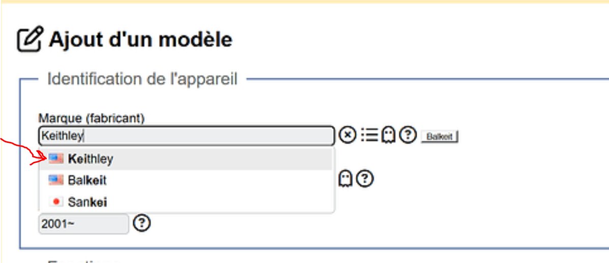 Aujourd’hui, en créant les fiches pour les Keithley 2400, 2410, 2420, 2425, 2430 et 2440, j’ai eu un petit soucis au niveau de l’entrée pour les marques. Utilisation du GL avec un ordinateur sous Windows 11 et navigateur Chrome.