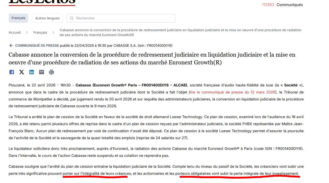 " Cabasse France la marque d’enceintes HIFI a été liquidée et reprise par les Allemands de Loewe – les actionnaires ruinés 2026-avril"