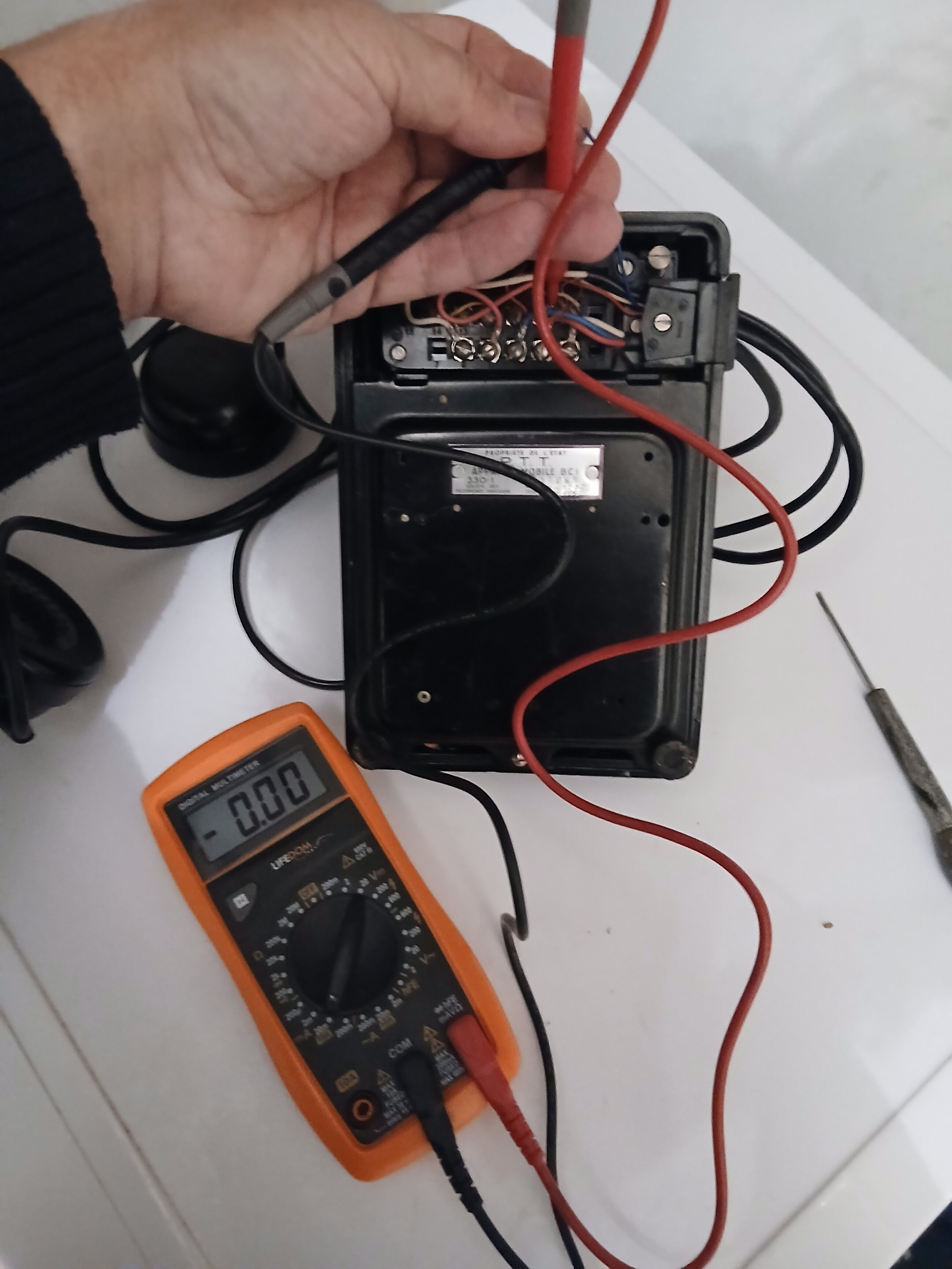 Vous décrochez le combiné, vous débranchez le fil bleu, et vous branchez votre ampèremètre entre ce fil bleu et la position du connecteur où il était raccordé. Normalement vous devriez mesurer entre 10 et 40mA. Environ. Si il n’y a pas de courant qui circule votre box ne détecte pas la présence de votre poste.