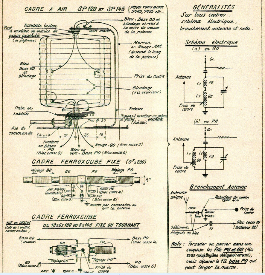 On y voit 2 bobines vertes, 2 rouges, 2 jaunes. Quelle signification ont ces couleurs? Sont elles en rapport avec les 3 fils qui viennent du cadre (Vert, Rouge et Incolore)? Par exemple les 2 rouges pour l’arrivée GO, l’une pour l’oscillation, et l’autre pour l’accord modulation? Ou alors cela n’a rien à voir (juste pour faire … joli…)?