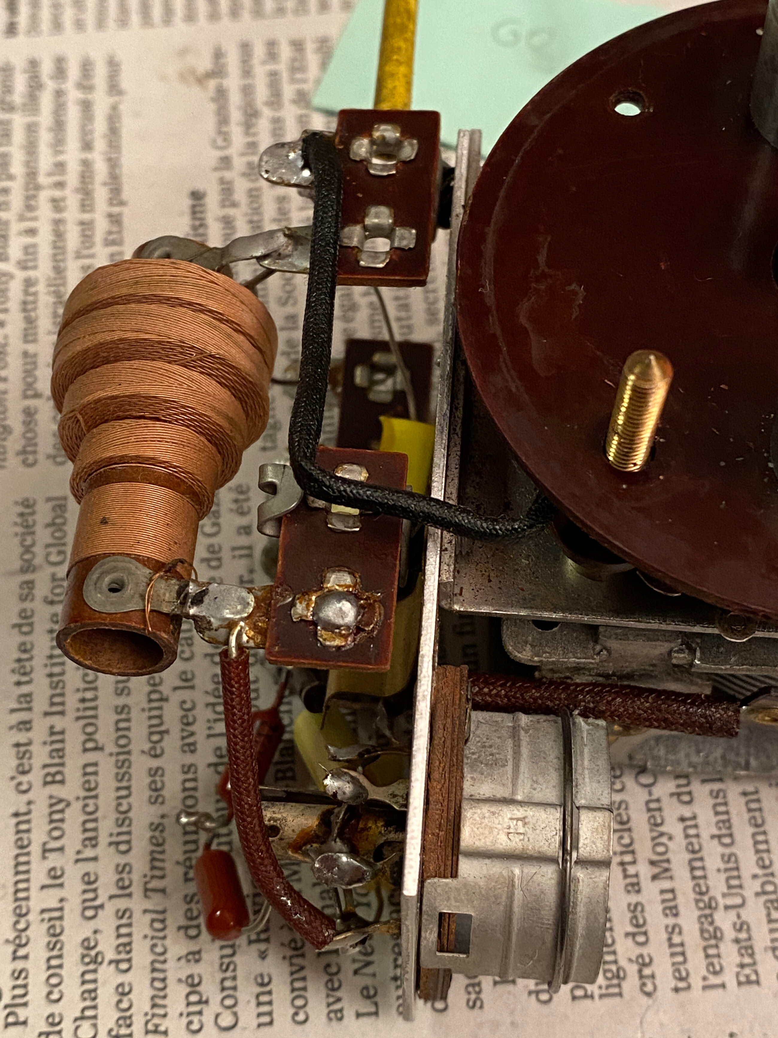 Je me suis fait avoir en pensant que la position de repos était un lien entre deux positions adjacentes. Le système de blocage n’est pas fait par des billes mais par le bouton qui défini la gamme d’onde. Les trois positions sont fixe et bloque le commutateur en bonne position. Bien évidemment démonté pour atteindre le commutateur, d’où erreur de ma part.
