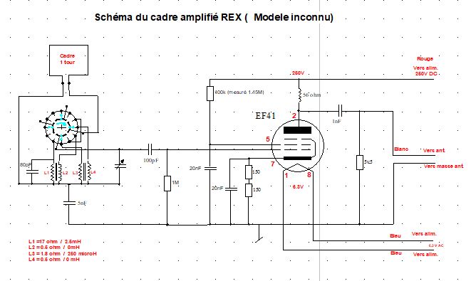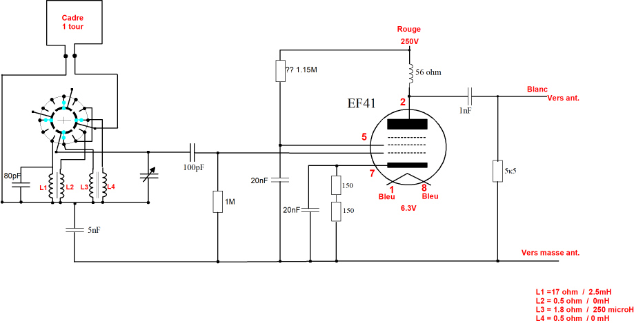 Voici le schéma complet du cadre. Il y a une résistance sur la grille 2 de la EF41 qui est noire. Elle a du chauffer un peu fort. Actuellement elle mesure 1.15 Mohm ce qui me parait vraiment beaucoup.