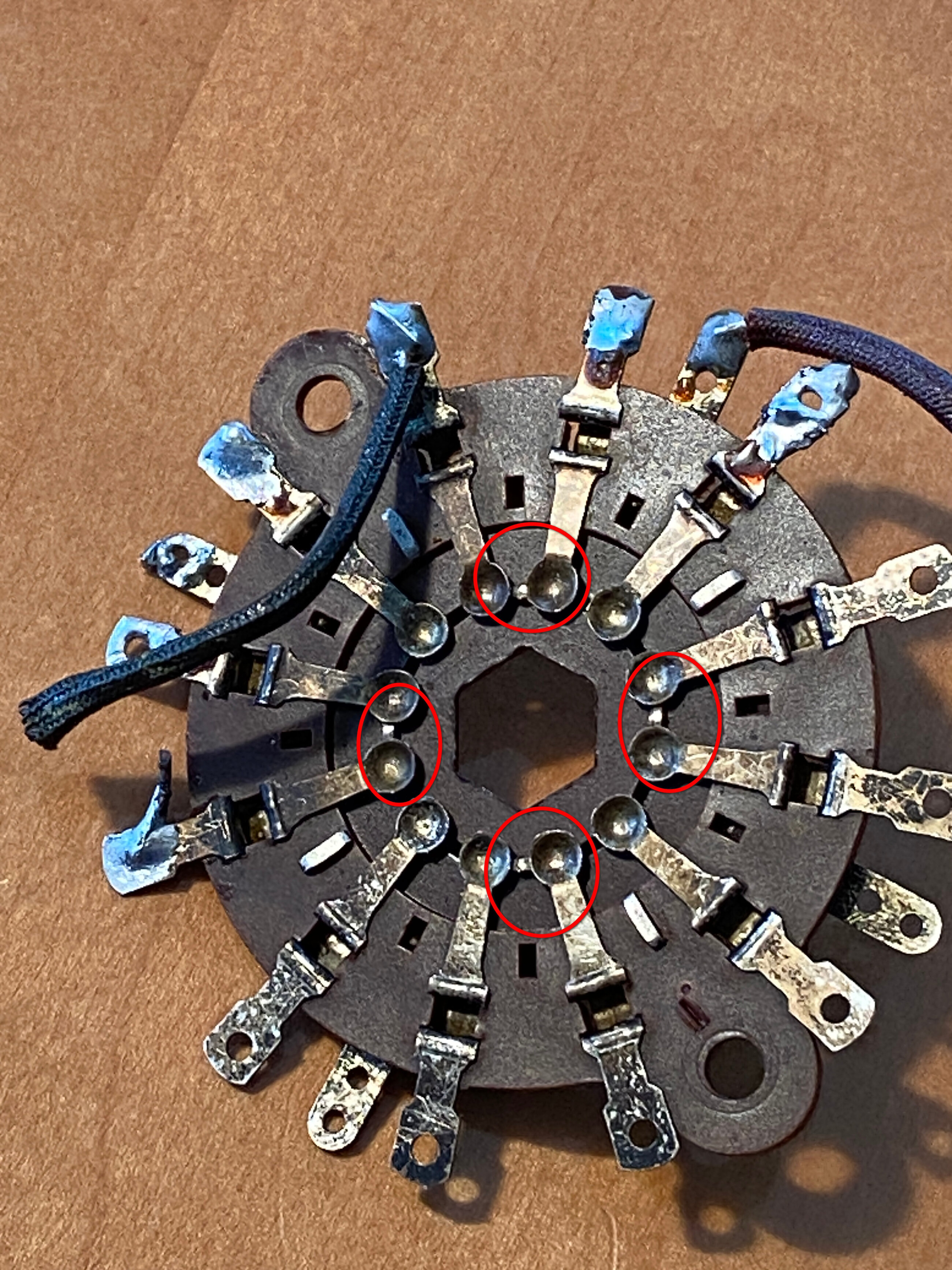 La position “a cheval” entre 2 lamelles de contact me parait pas normale, et si ça se trouve, ce commutateur est défectueux !? (indexage cassée ou tordu ? axe ovalisé ou vrillé ? galette ayant pris du jeu ou mal montée ? )