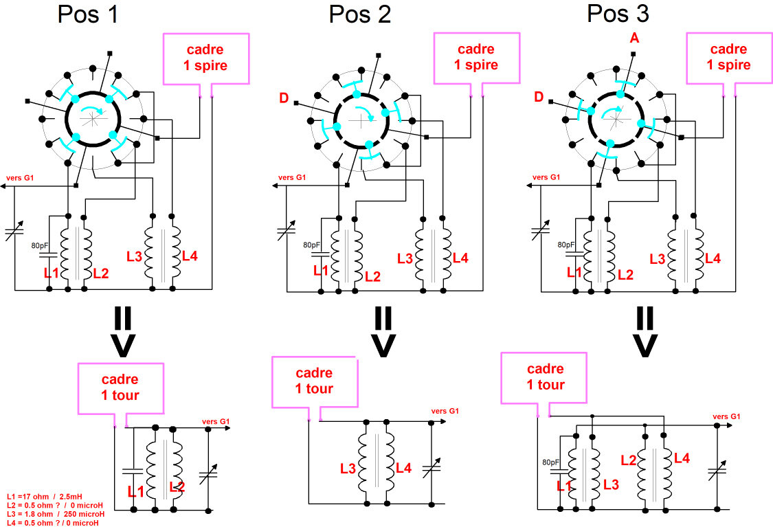 Un indice, en tournant d’un demi pas (dans le sens du tire bouchon pour le petit coup de blanc du déjeuner), en position 1 l’antenne va direct sur le CV et sortie, en position 2 c’est le jeu L4/L3 qui commutent sur antenne/CV, en position 3 c’est L2/L1.