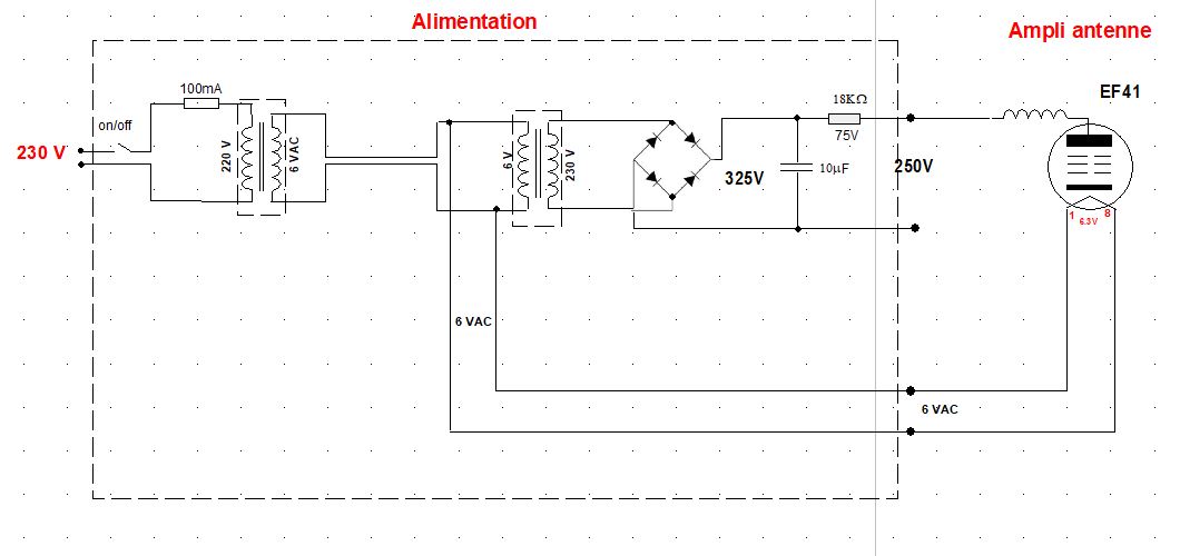 Dans le cas ou l’alimentation de l’antenne se fait par le poste radio directement, le 250V et le chauffage 6.3V sont liés/référencé dans la radio.
