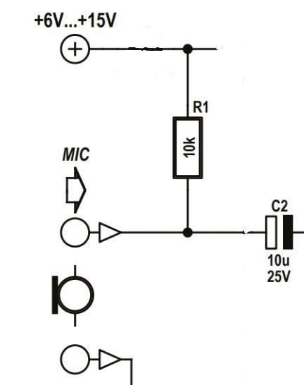 Comme ceci avec une alimentation depuis le + avec une résistance de 10 kΩ et un condensateur en série, le tout relié a un amplificateur BF.