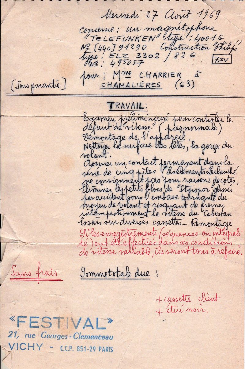 Comme je collectionne les magnétophones, j’ai acheté sur le bon coin un petit cassette TELEFUNKEN 4001 je recherche d’ailleurs tous les dérivés du pionnier, le PHILIPS EL3300 j Soigneusement glissé dans la housse, une petite fiche d’intervention d’un réparateur professionnel, fiche que je vous invite à découvrir pour constater le sérieux d’une profession quasi disparue