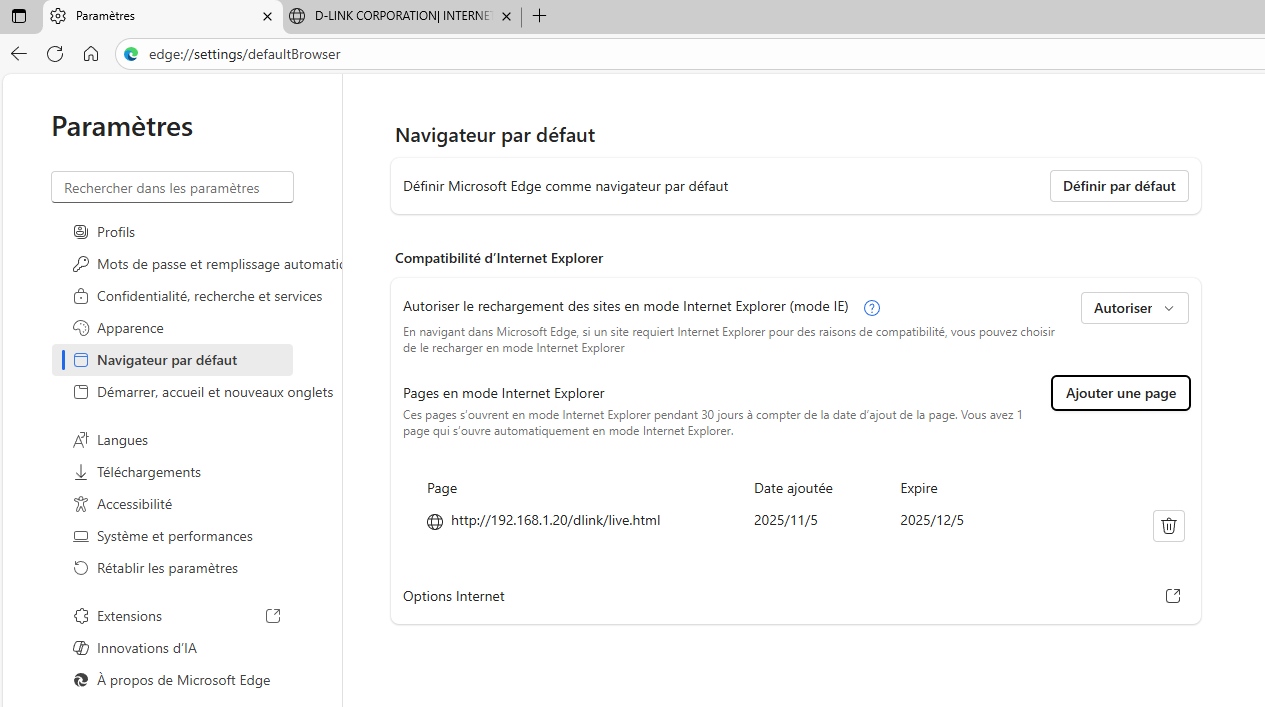 Ci dessous le page des paramètres à appliquer dans Edge.