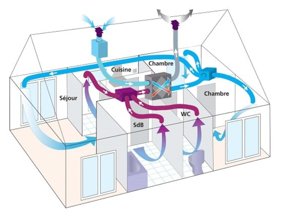 Cette VMC aspire l’air de l’extérieur pour l’injecter dans la maison et extrait en même temps l’air intérieur. Les 2 flux d’air se croisent dans un échangeur thermique et passent par l’évaporateur de la PAC intégrée à la VMC.