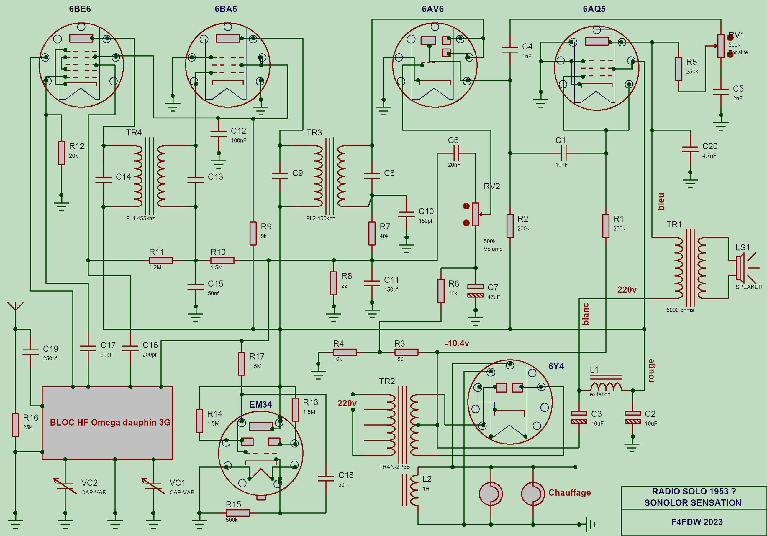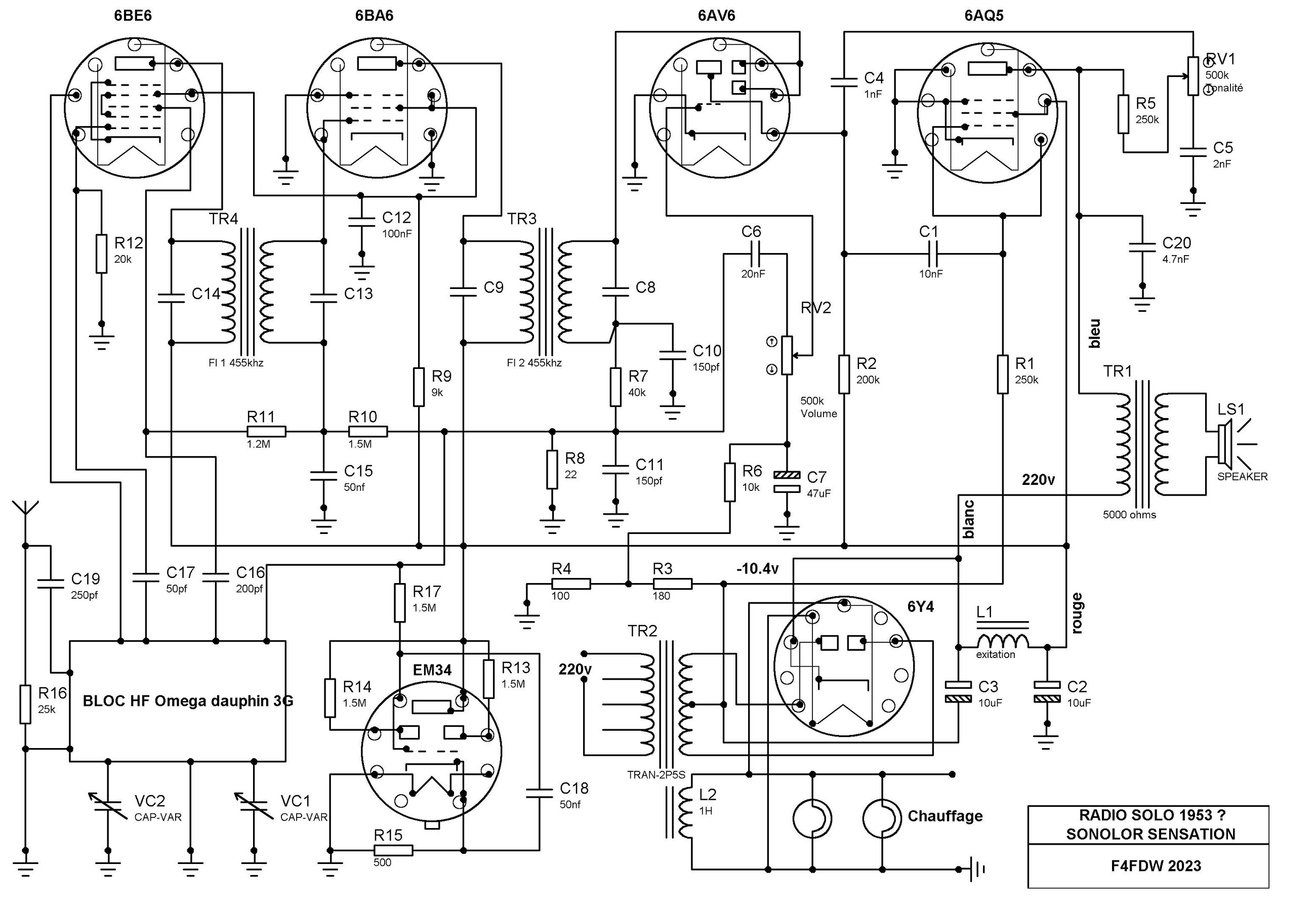 Merci Radiolo,c est le Sensation de 1954 avec la 6AF7.C était pour un Ami qui achète de joli radio et qui s amuse à changer tous les chimique la je suis d accord, et hélas il change tous les condos goudrons pas d accord{sauf le CL} c est pas son métier ! je te dit pas toutes les erreurs de câblage qu il fait .mtn je lui ai dit qu il me porte le radio avant de le toucher bref, problèmes résolu ,châssis classique qui peut se dépanner sans schéma{en toute modestie}