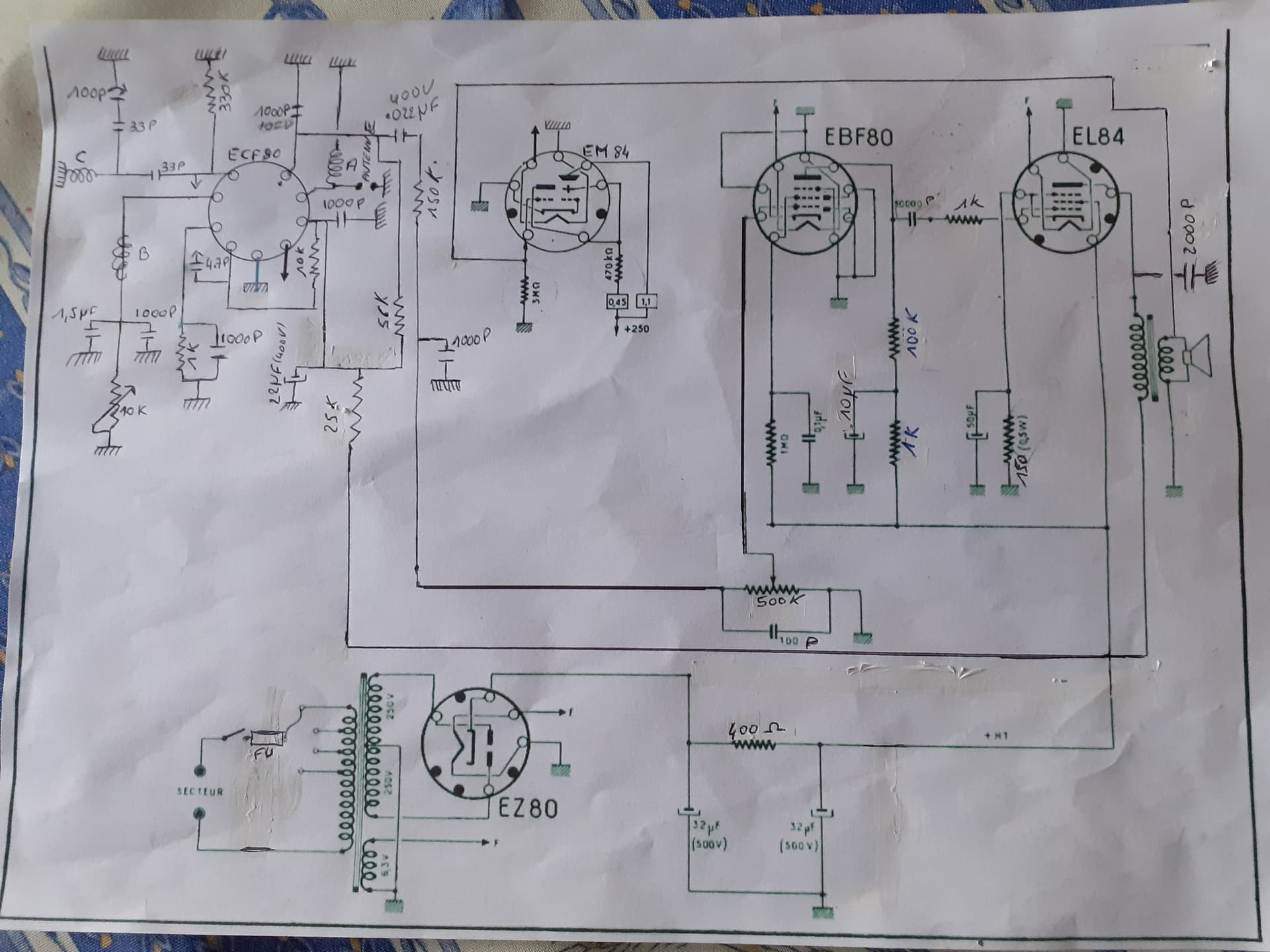 Oui, mais, y a t-il le potentiomètre (500k), ou une résistance, au point de jonction de la 1K et du condensateur venant de la plaque de l’EBF80 ?