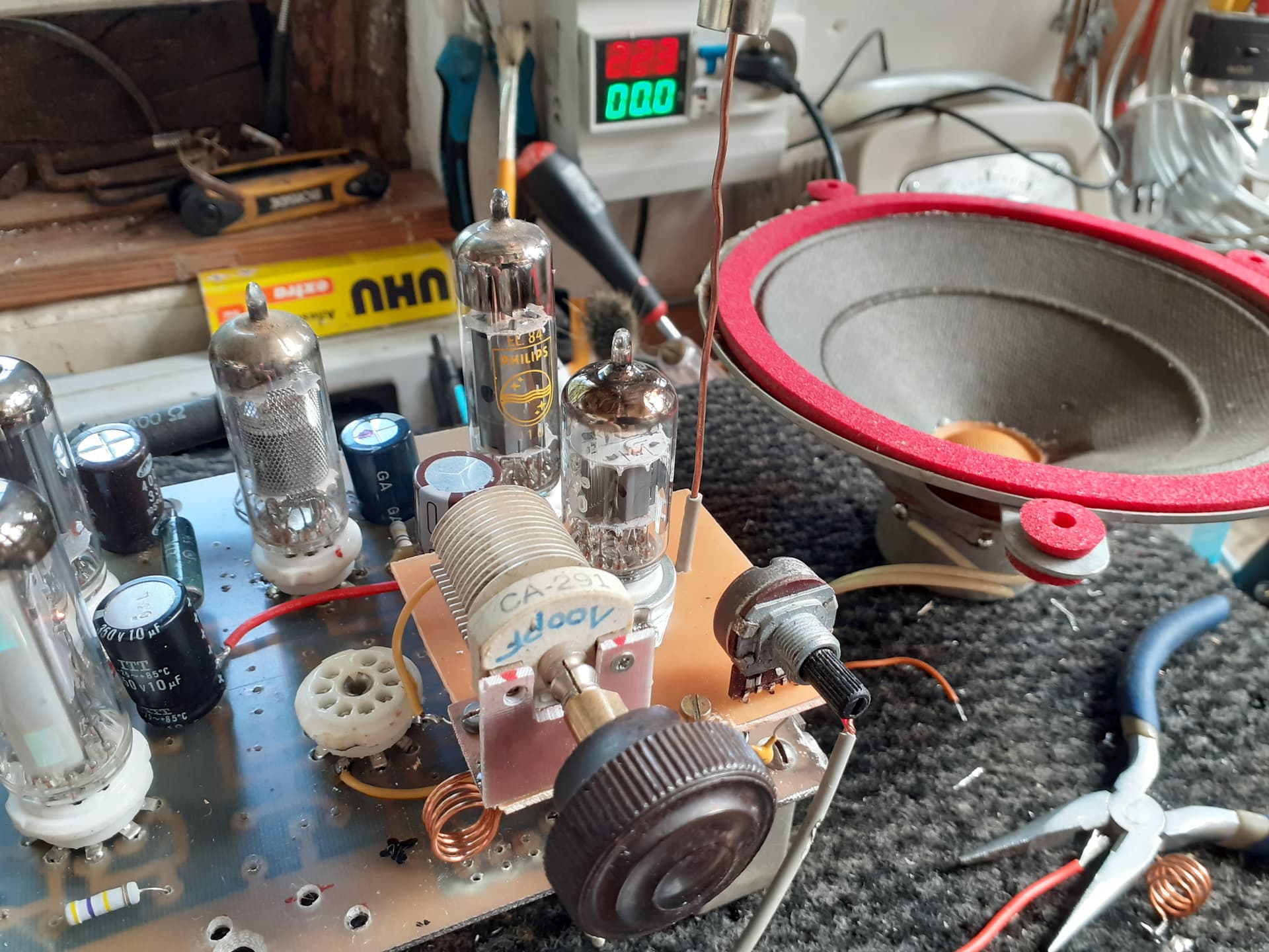 Pour le réglage c’est assez simple ,on ferme complètement le CV on ajuste la bobine d’accord C en serrant ou écartant  les spires  pour trouver une station sur 88mhz puis on ouvre le CV pour obtenir le haut de gamme 108mhz , j’utilise des pinces en plastique comme celles qu’utilise les infirmiers pour changer un pansement, on peut jouer aussi avec le potentiomètre de 10 kohms sur la cathode pour plus ou moins de sensibilité on doit arriver au décrochage si on pousse trop loin !