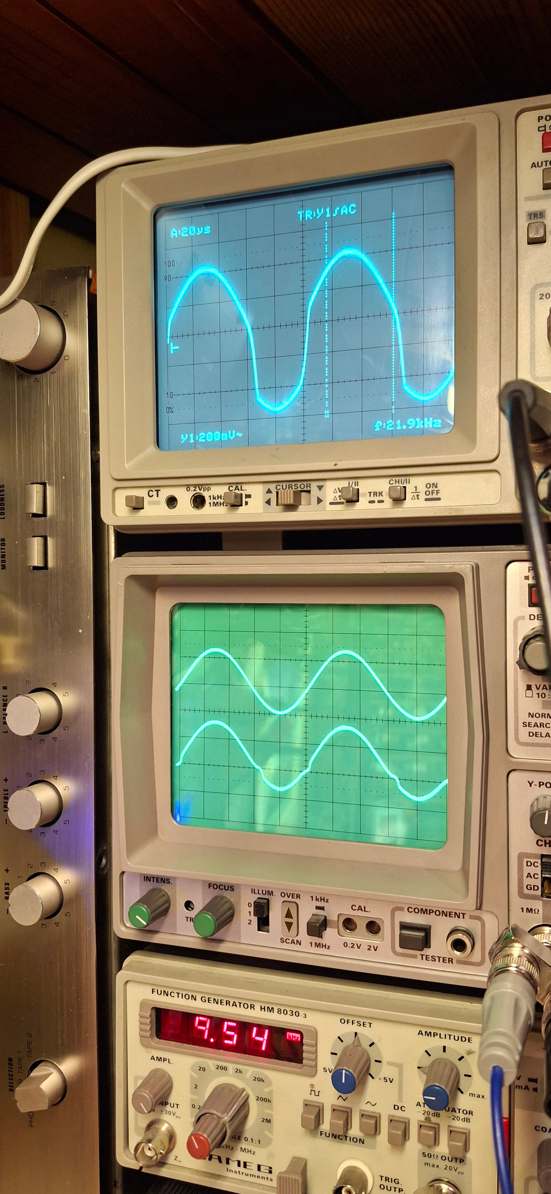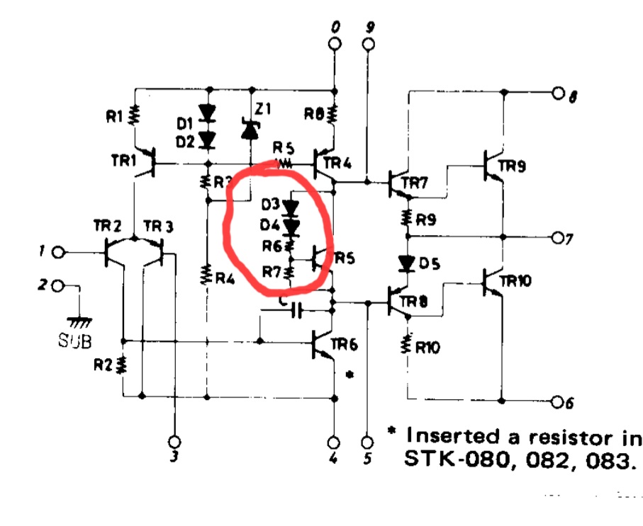 Étant donné que TR5 et les deux résistances constituent déjà un multiplicateur de VBE, ceux qui ont reproduit ce module on peut-être jugé les diodes superflues. D’ailleurs, la mauvaise polar vient peut-être de là car si le rapport des résistances est le même, on a une polarisation plus faible sans les diodes, ça pourrait expliquer la distorsion de croisement.