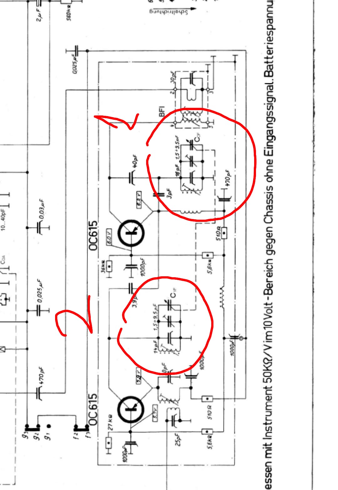 Sur le schéma du poste j’ai identifié les deux points à intervenir (trimmers et noyaux) indiqués en rouge sur le schéma. J’avoue que je ne suis pas certain d’avoir bien identifié les éléments concernés. Du coup si quelqu’un pourrait me les confirmer j’en serai reconnaissant.