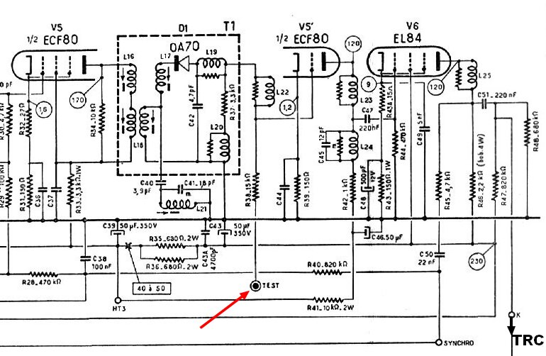 Si c’est un TV CCIR, cela devrait fonctionner au point test mais il faudrait déconnecter la détection (par exemple en déconnectant L22 et la résistance en parallèle et en reliant la grille de l’ECF80 à la masse par une résistance de 75 à 200 ohms).