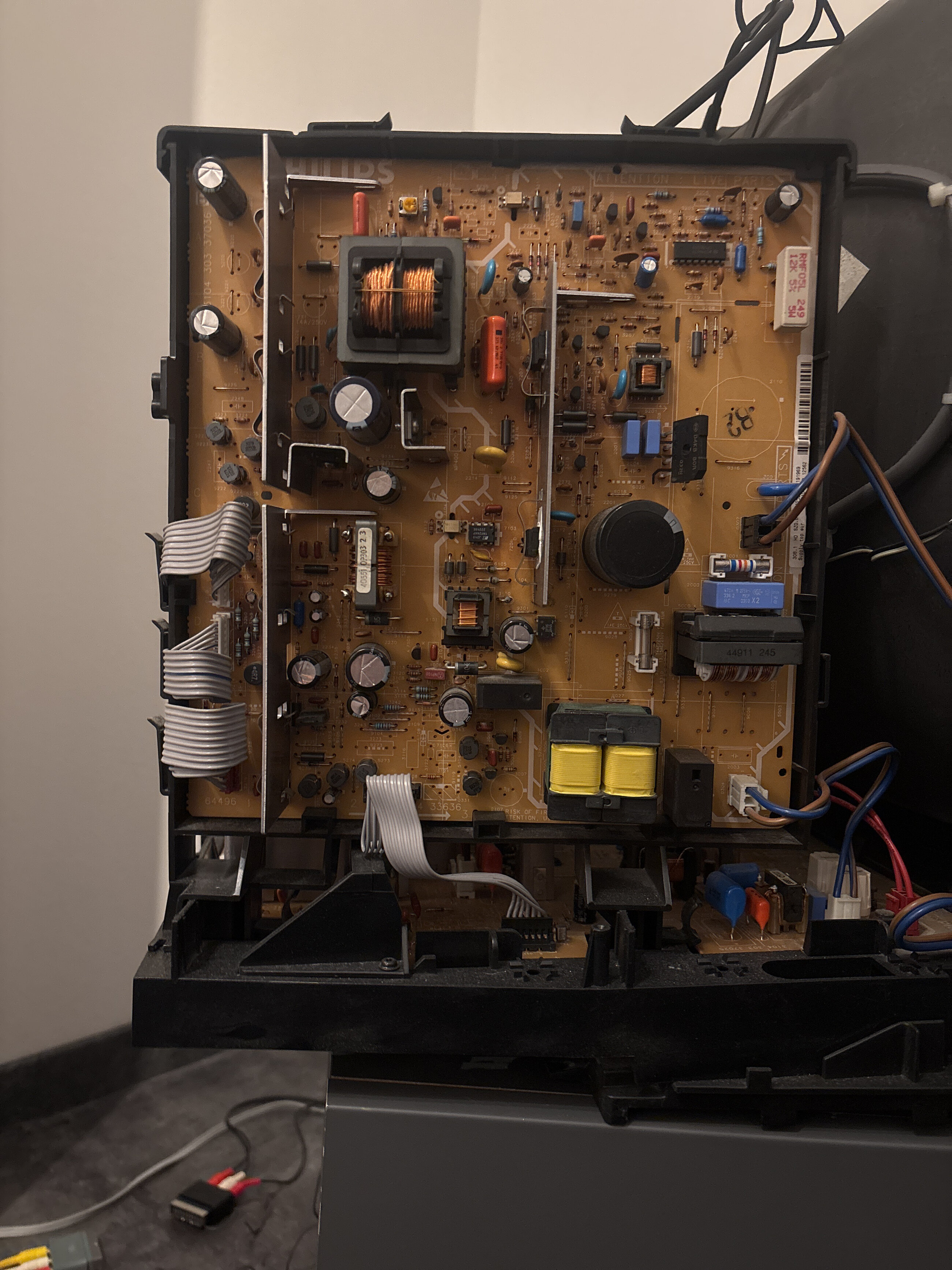 J’ai une TV Philips 32 PW 9617/12 (CRT) qui a un problème. Au début elle s’allumait mais après quelque temps elle a commencé à ne plus s’allumer mais en la débranchant quelque minute elle re fonctionnait , donc je l’ai ouverte pour regarder la carte. J’ai remarqué qu’un composant a grillé.Aussi quand j’ai appuyer sur le bouton de la tv pour l’allumer elle a essayer de démarrer elle fait les lumières rouge orange puis refait la même chose jusqu’à clignoter en rouge .