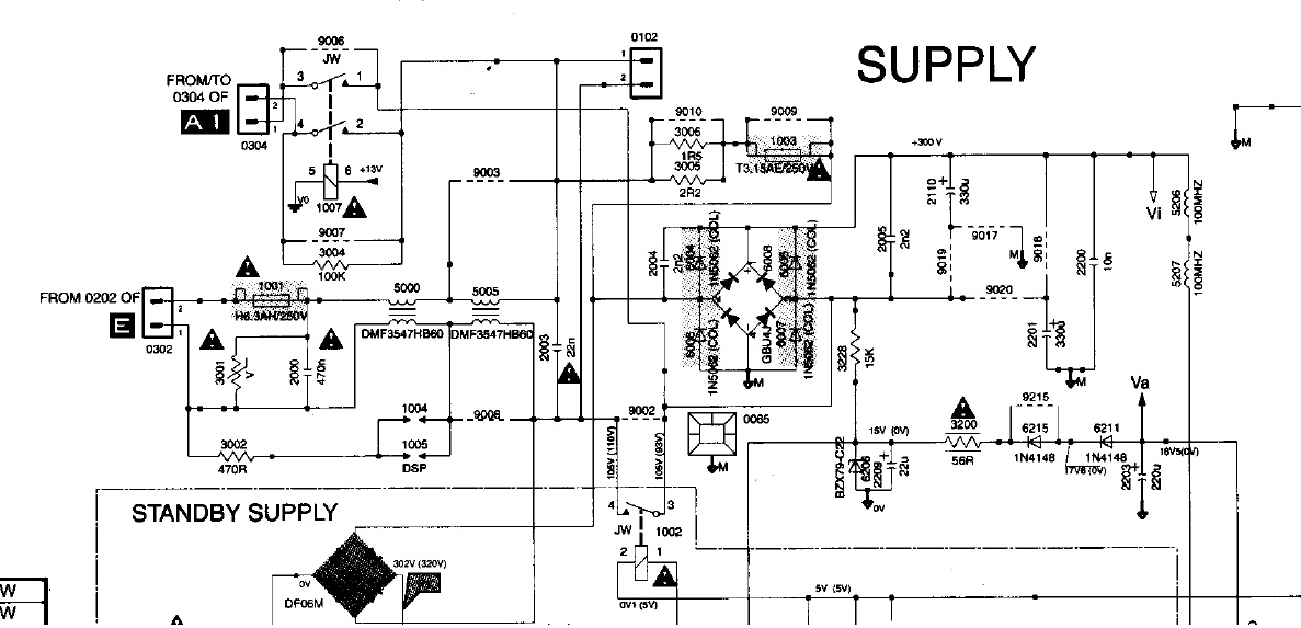 il semble que l’éclateur soit en // avec la bobine anti parasite (CEM) qui a le reperd 5000 via 3002 (470 ohms), il faudra commencer a regarder de ce coter la …(soudure, bobine coupé ?)
