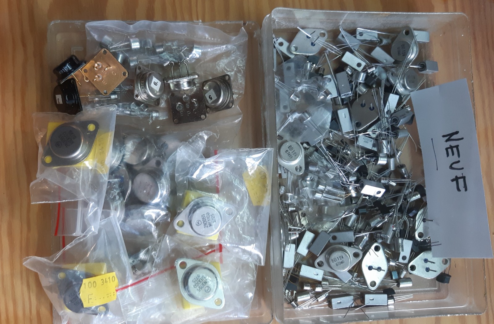 Une boite de composants neufs. Entre autres:2n3055,2n3053,2n2907,AC187,188,128,125,126,AF139,239,BD124,BF195,194,197,167,ST724,722……